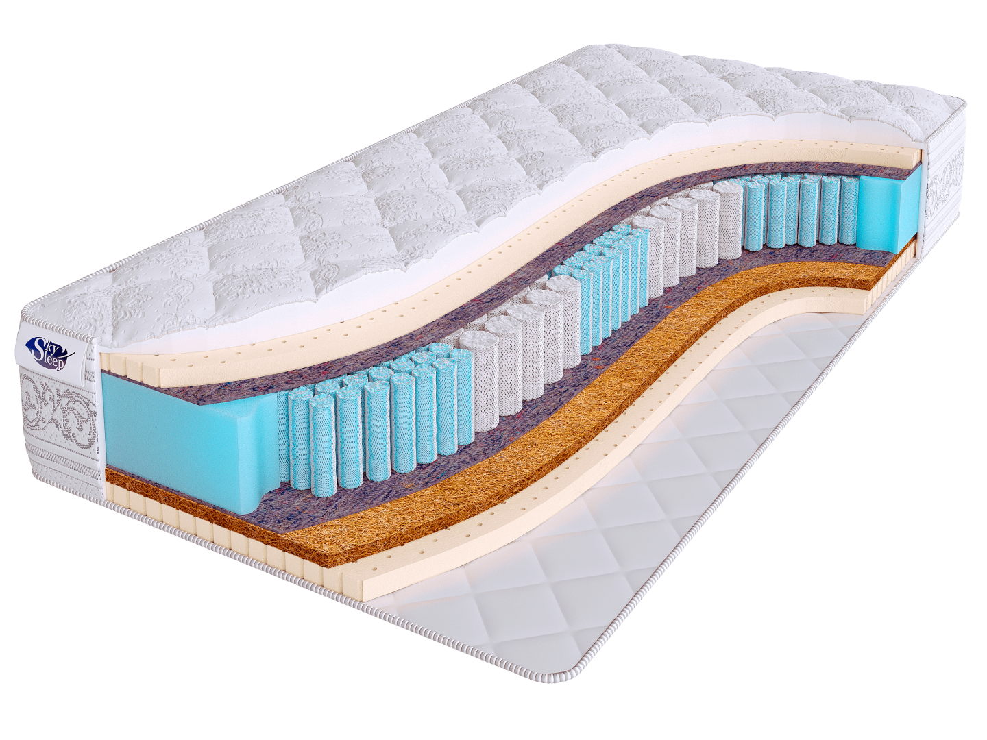 Основными наполнителями модели являются натуральный латекс и латексированная кокосовая койра. Латекс придает поверхности матраса мягкость и делает сон на нем комфортным и удобным, а кокосовая койра, расположенная на одной из сторон, способствует созданию упругой поддержки позвоночника и равномерному распределению нагрузки на пружинный блок.