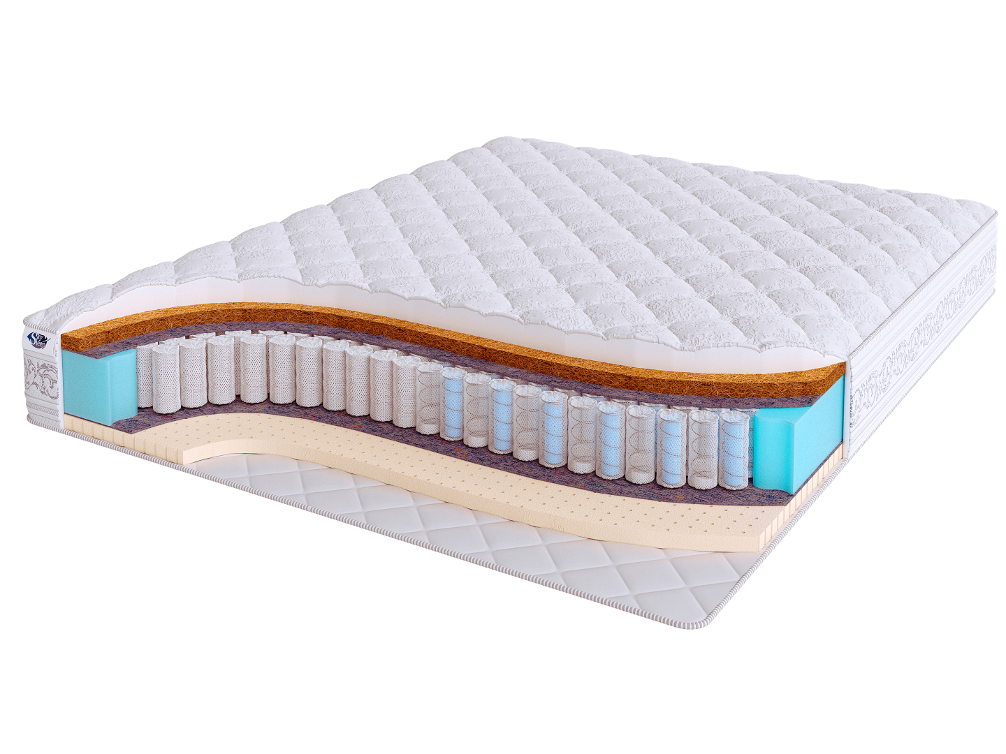 Основными наполнителями модели являются натуральный латекс и латексированная кокосовая койра. Латекс придает поверхности матраса мягкость и делает сон на нем комфортным и удобным, а кокосовая койра, расположенная на одной из сторон, способствует созданию упругой поддержки позвоночника и равномерному распределению нагрузки на пружинный блок.