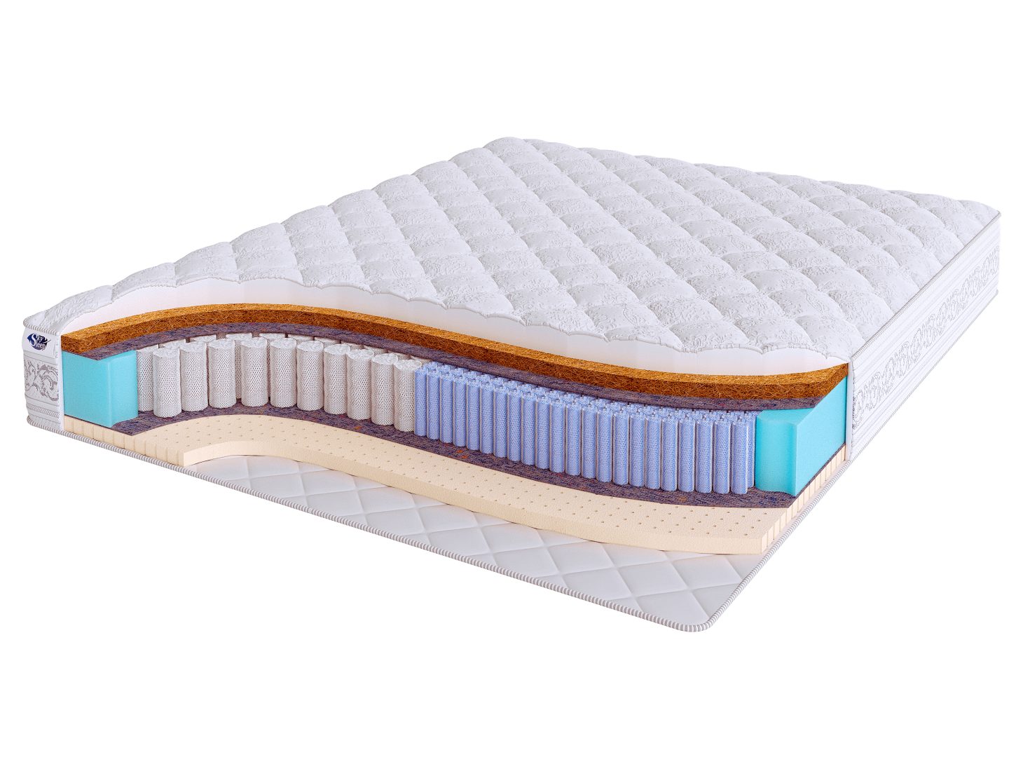 Основными наполнителями модели являются натуральный латекс и латексированная кокосовая койра. Латекс придает поверхности матраса мягкость и делает сон на нем комфортным и удобным, а кокосовая койра, расположенная на одной из сторон, способствует созданию упругой поддержки позвоночника и равномерному распределению нагрузки на пружинный блок.