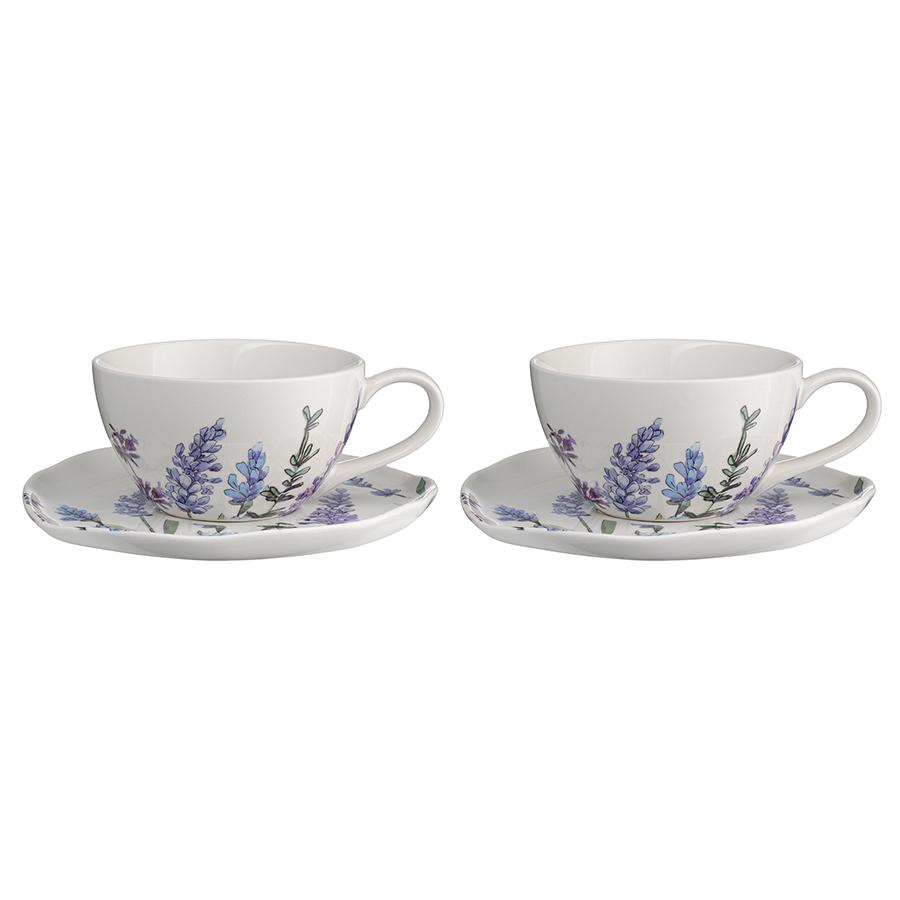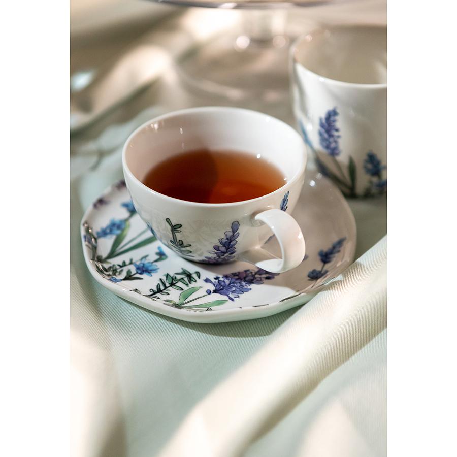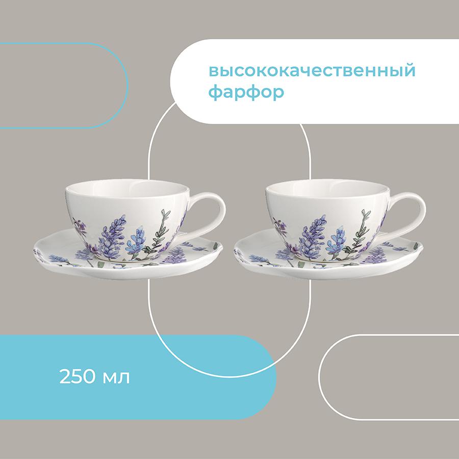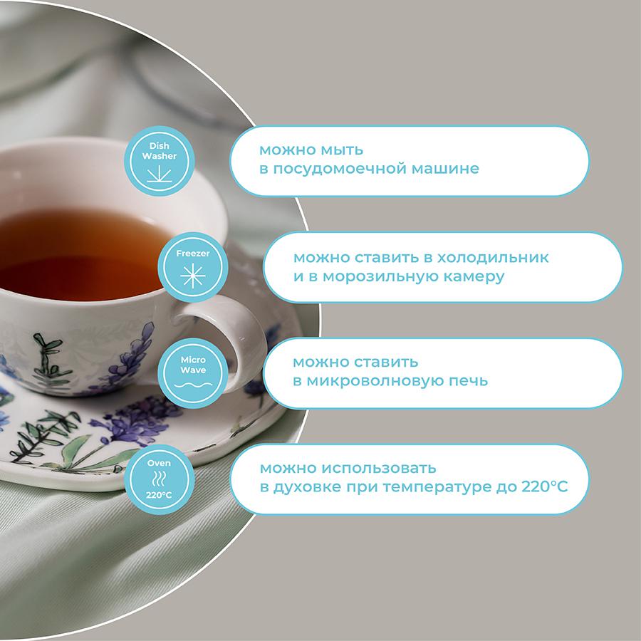 Чашки с блюдцами из коллекции Floral – прекрасный вариант для всех, кто ценит сочетание качества и эстетики. Цветущая лаванда, изображенная на белоснежной поверхности, превращает посуду в настоящее украшение стола. Такая чайная пара идеально подходит для уютных чаепитий в стиле кантри и прованс. Материал изготовления неприхотлив в уходе, не впитывает загрязнения, является экологичным и безопасным для здоровья. Чистое сырье высочайшего качества и собственная формула глазуровки с обжигом при температуре 1250 °C делают изделия из фарфора особо прочными, устойчивыми к растрескиванию и появлению сколов. Глазурь и декор не тускнеют со временем, сохраняя первоначальный цвет и блеск. Наши продукты прошли испытания на отсутствие в составе свинца и кадмия в соответствии со стандартными тестами FDA. Материал: фарфор. Объем чашки: 250 мл. Диаметр блюдца: 16 см. Количество предметов в наборе: 4 шт. Посуду рекомендуется очищать от загрязнений в теплой воде с помощью мягкой губки с жидким средством. Допускается мытье в посудомоечной машине, использование в морозильной камере, микроволновой печи и духовке при температуре не выше 180 °C.