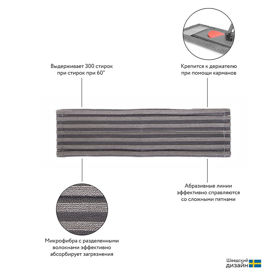 Сменная насадка из жесткой микрофибры предназначена для интенсивной влажной уборки. Практичный аксессуар с абразивными линиями эффективно справляется со сложными пятнами и твердой грязью, не царапая пол. Микрофибра подходит для всех типов напольных покрытий: кафеля, керамогранита, ламината, дерева и линолеума. Насадка надежно крепится на флаундере, что препятствует ее соскальзыванию в процессе уборки. Микрофибра выдерживает до 300 стирок при температуре до 60?.