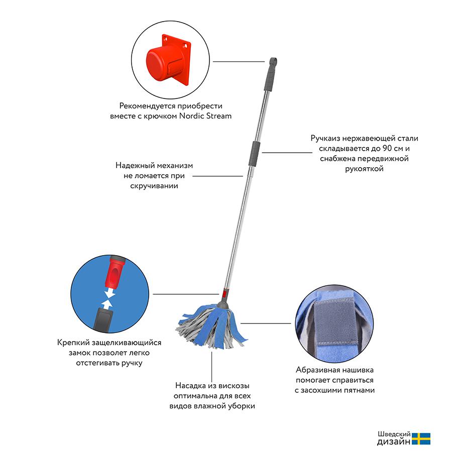 Швабра для мытья пола с насадкой из вискозы Bucket – эффективно удаляет грязь и пыль на всех видах напольных покрытий. Она идеально справляется даже с застывшими липкими пятнами. Насадка из вискозы подходит для влажной уборки полов из дерева, линолеума, керамогранита, ламината и кафеля. Телескопическая ручка длиной 90 см может раздвигаться до 160 см. Она выполнена из прочной нержавеющей стали. Ручка дополнена пластиковым колпачком с петлей для хранения. Швабра Bucket отлично сочетается с ведром марки Nordic Stream