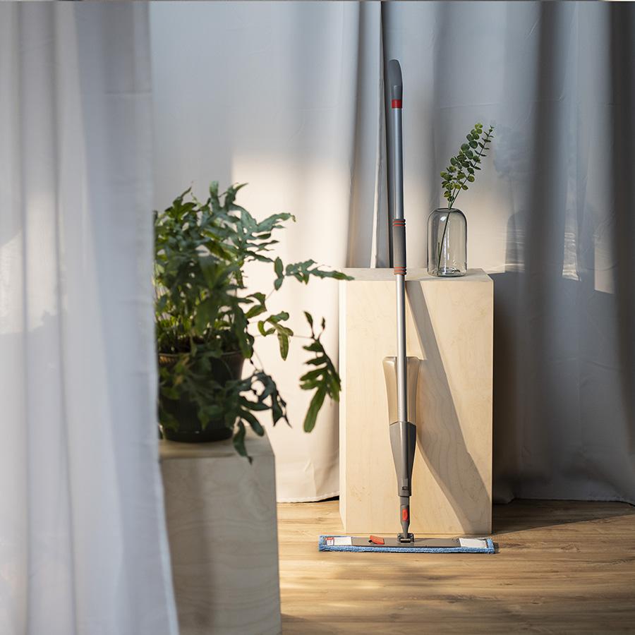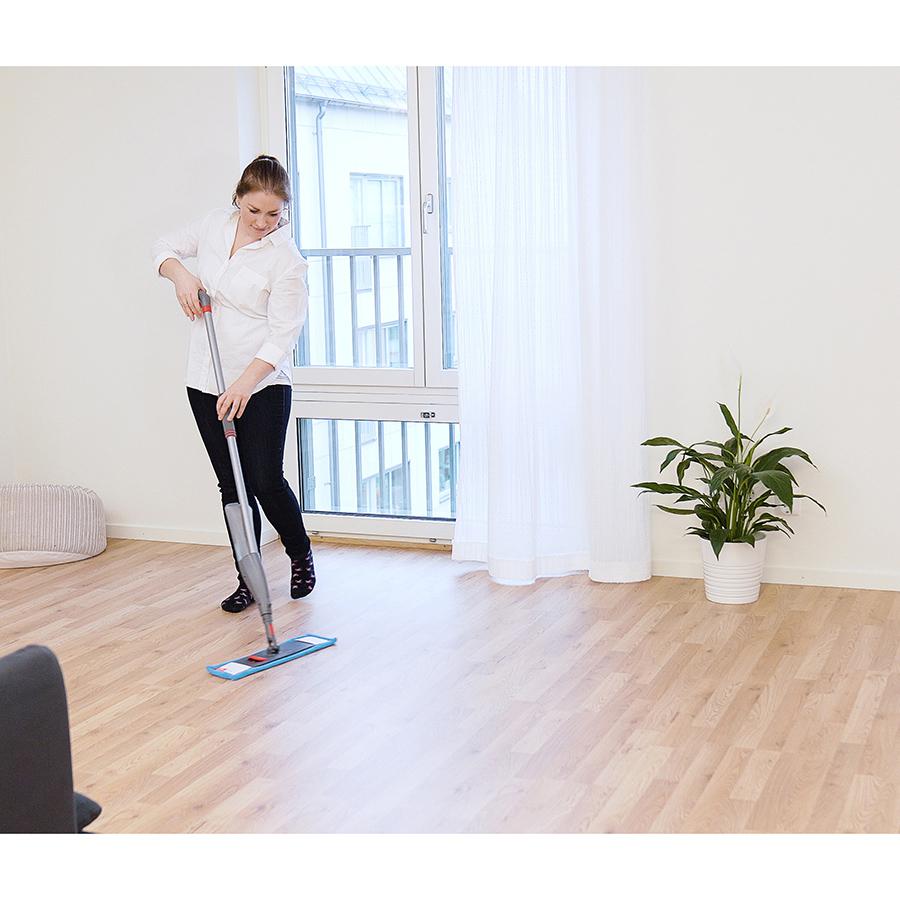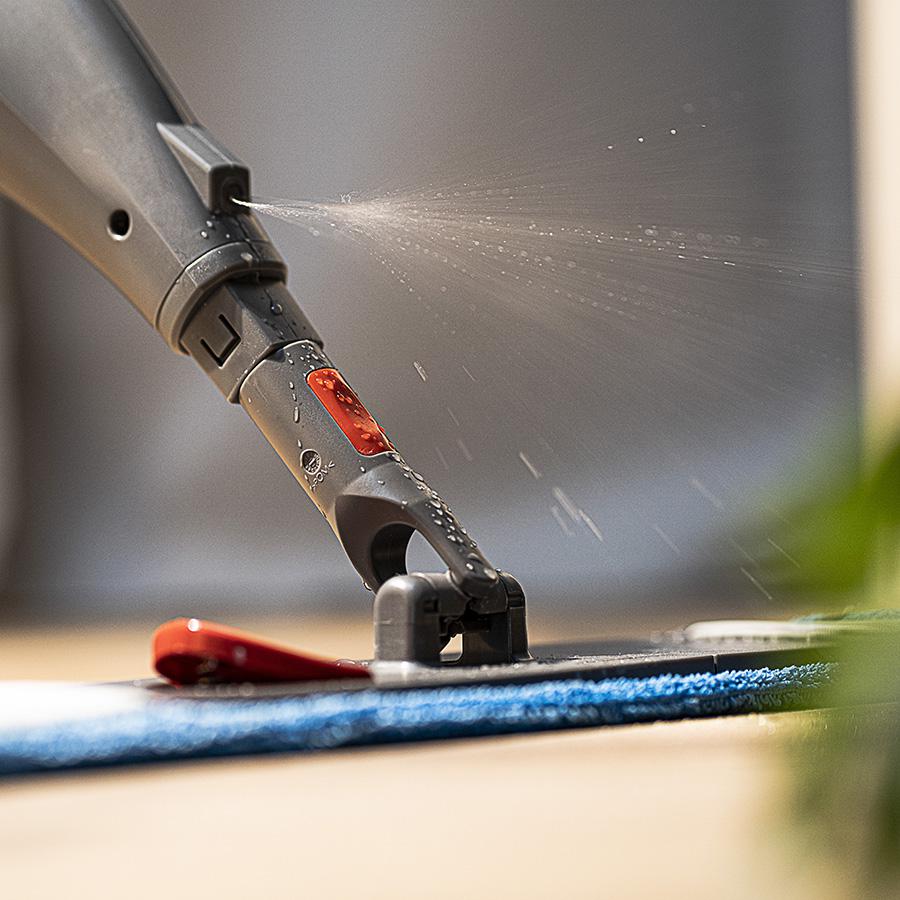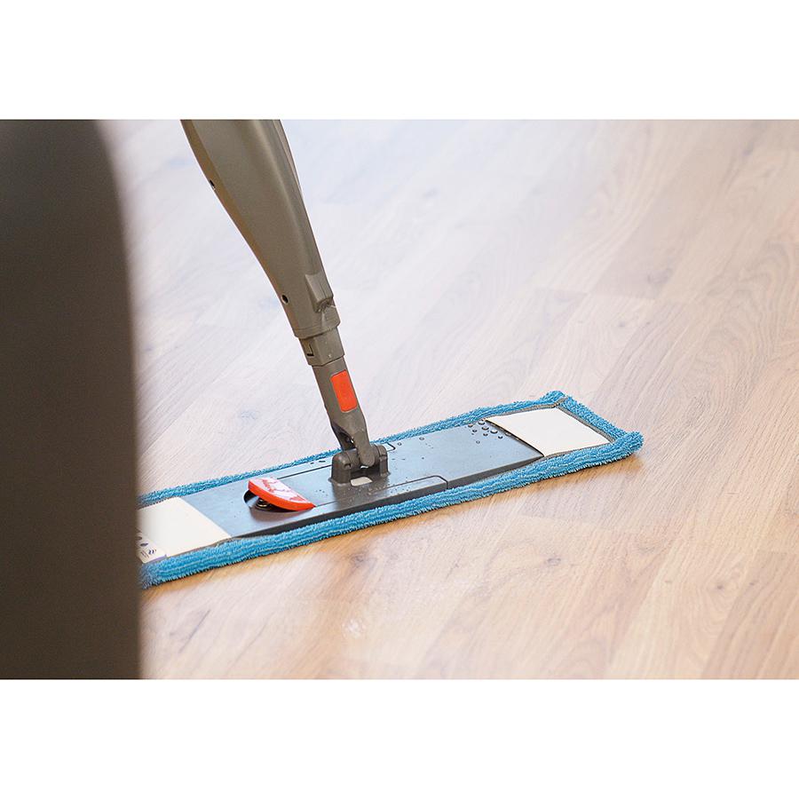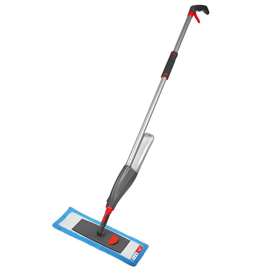 Швабра с распылителем избавит от необходимости снимать и мочить тряпку при высыхании. В комплект входят ручка 130 см со встроенным пусковым механизмом и насадка-распылитель, емкость 0,5 л и микрофибра. Выжимая спусковой крючок, распыляйте воду или моющее средство перед шваброй. Уровень жидкости в емкости можно легко пополнить при необходимости. Швабра из микрофибры хорошо подходит для влажной уборки и эффективна на всех типах твердых полов.