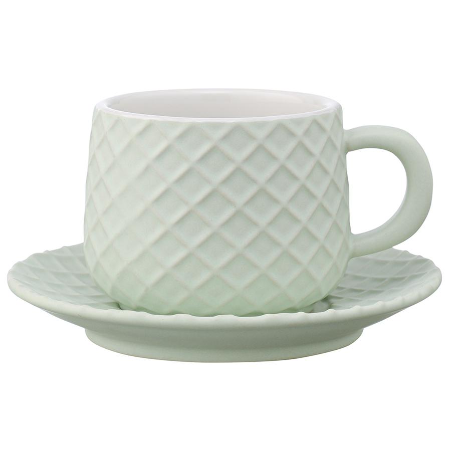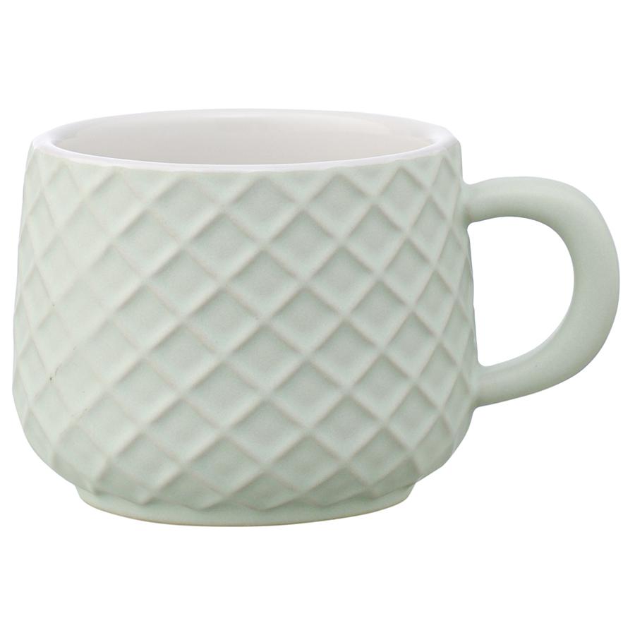 Коллекция посуды Marshmallow привнесет в ваш дом ощущение тепла, поможет создать идеальную атмосферу для приема гостей и уютных семейных застолий. Чайная пара из коллекции Marshmallow – оптимальный вариант для тех, кто предпочитает сочетание практичности и необычного дизайна. Чашка и блюдце выполнены из каменной керамики с отличными эксплуатационными свойствами, среди которых экологичность, устойчивость к износу и температурным перепадам. Материал не впитывает запахи и загрязнения. Глазурованное покрытие легко очищается, обеспечивает изделиям декоративный вид и защищает от внешних воздействий. Узор, напоминающий соты, и интересная утолщенная ручка придают посуде особый шарм. Наши продукты прошли испытания на отсутствие в составе свинца и кадмия в соответствии со стандартными тестами FDA. Материал: каменная керамика. Объем чашки: 300 мл. Цвет: мятный. Допускается мытье в посудомоечной машине, заморозка, использование в микроволновой печи и духовке при температуре не выше 230 °C.