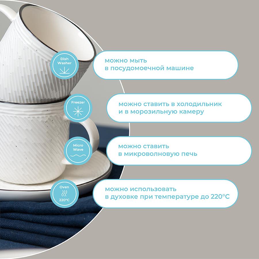 Чайная пара из белоснежного фарфора серии Contour станет неотъемлемой частью уютного чаепития. Рельефная поверхность и декоративная окантовка придают посуде оригинальный вид. Материал изготовления неприхотлив в уходе, не впитывает загрязнения, является экологичным и безопасным для здоровья. Набор идеально подходит как для повседневной, так и для праздничной сервировки стола. Чистое сырье высочайшего качества и собственная формула глазуровки с обжигом при температуре 1250 °C делают изделия из фарфора особо прочными, устойчивыми к растрескиванию и появлению сколов. Глазурь и декор не тускнеют со временем, сохраняя первоначальный цвет и блеск. Наши продукты прошли испытания на отсутствие в составе свинца и кадмия в соответствии со стандартными тестами FDA. Материал: фарфор. Размеры: 16х16х8,5 см. Объем: 250 мл. Количество предметов в наборе: 2 шт. Посуду рекомендуется очищать от загрязнений в теплой воде с помощью мягкой губки с жидким средством. Допускается мытье в посудомоечной машине, использование в морозильной камере, микроволновой печи и духовке при температуре не выше 180 °C.