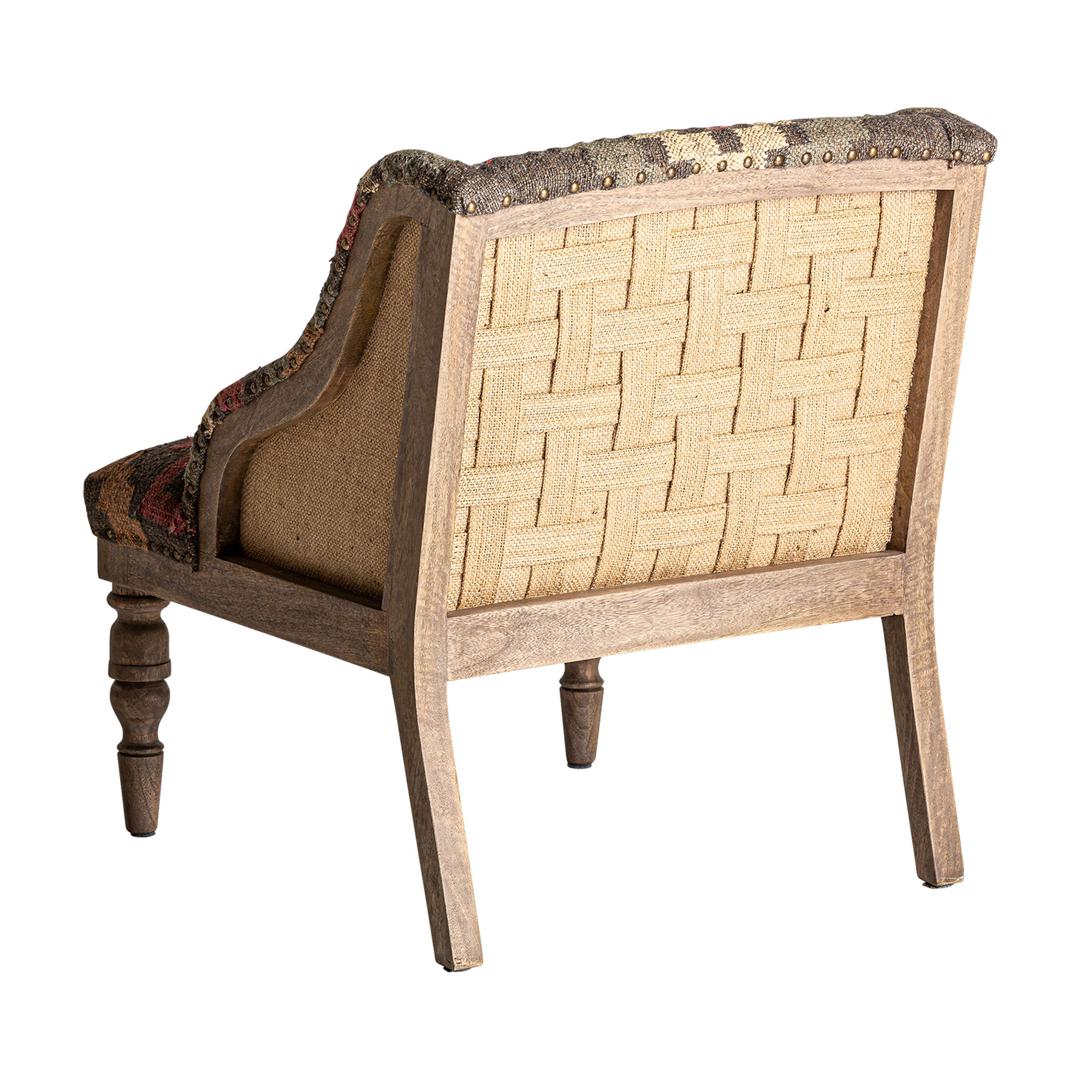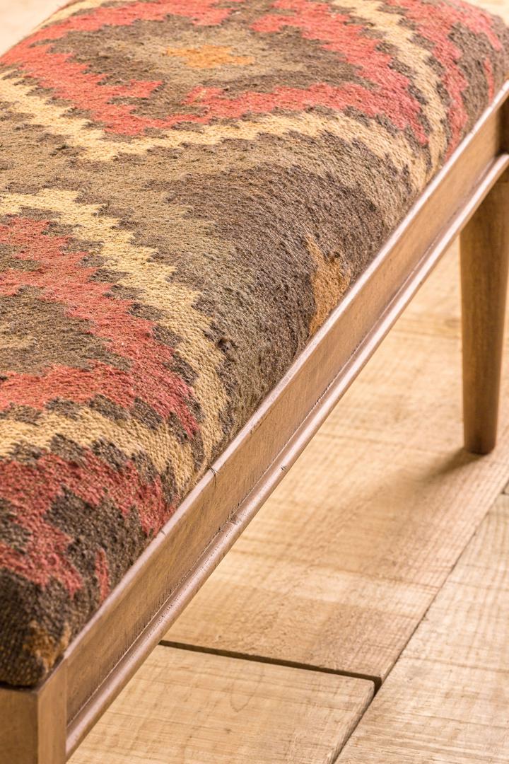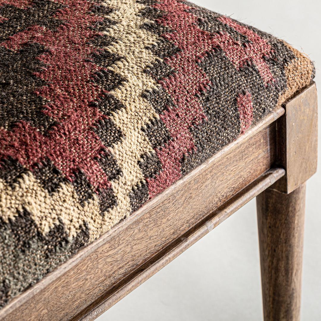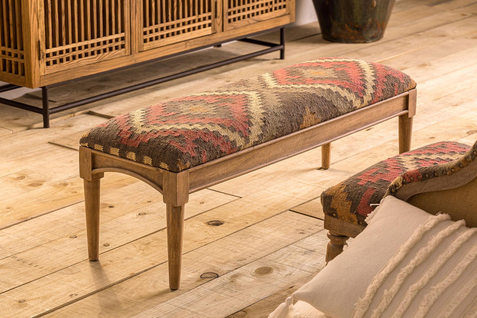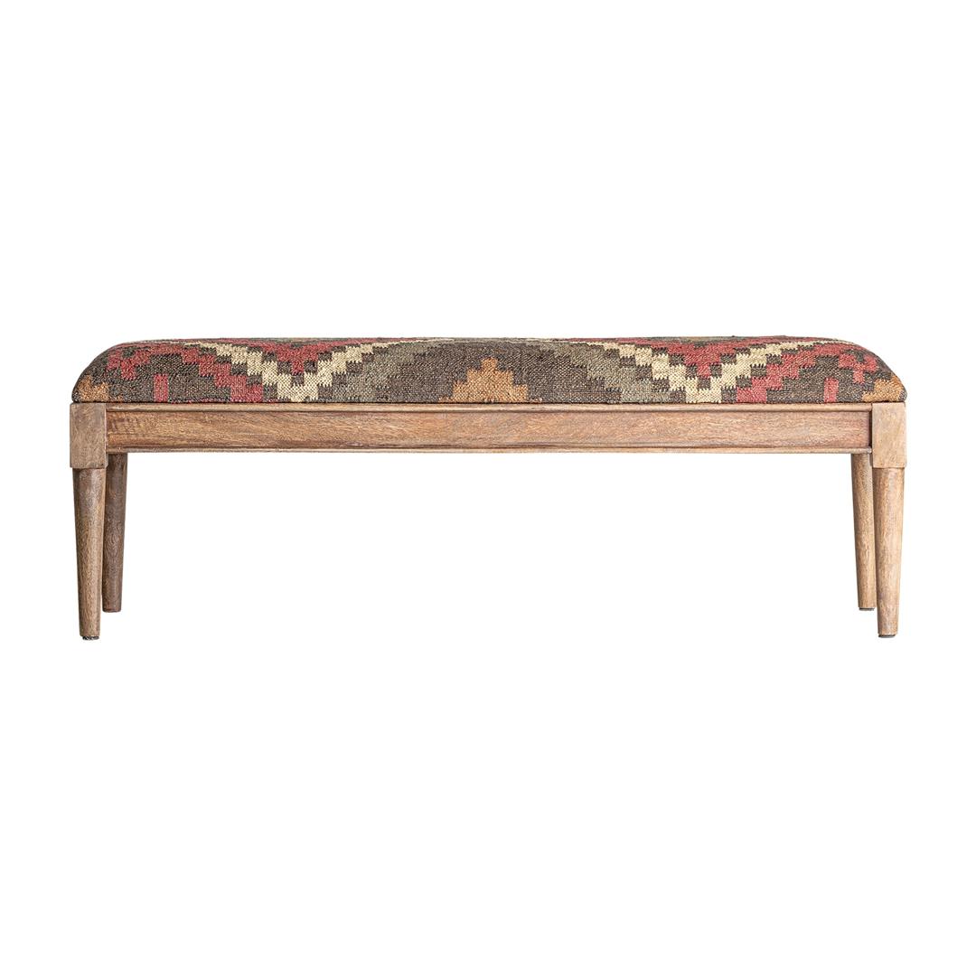 Скамейка-RAKEK, натуральный печатный цвет, колониальный стиль. Изготовлен из древесины манго в сочетании с джутом и пеной. Ширина: 130 см, Глубина: 40 см, Высота: 47 см.