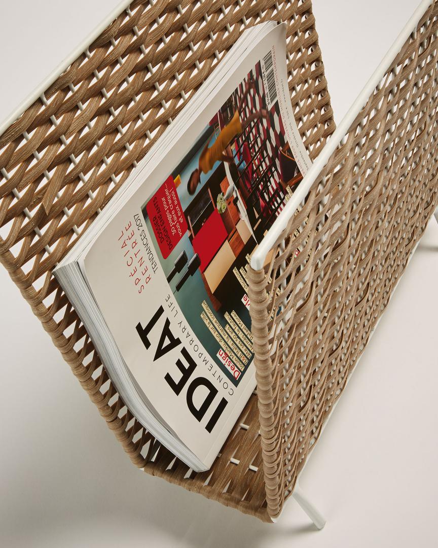 Стойка для журналов из белого металла и натурального ротанга.
