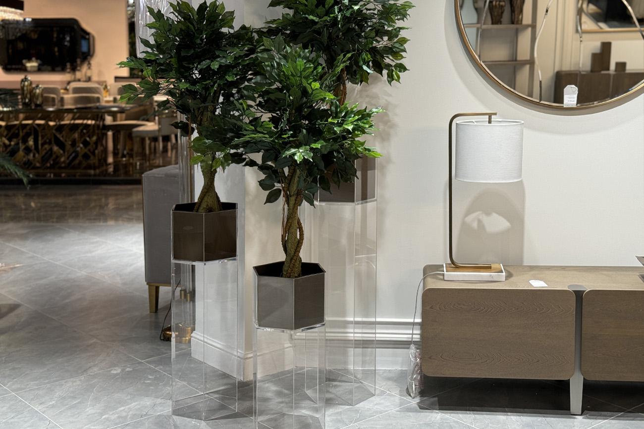 Это высокое напольное кашпо — скульптурный акцент, наполняющий пространство динамикой. Его шестигранная форма, где кристальный акрил встречается с благородной бронзой, создает завораживающий контраст и эффект невесомости для растения. Такое кашпо из акрил...