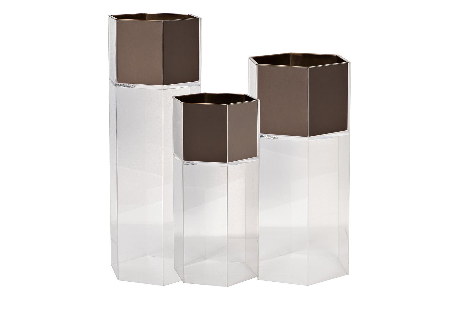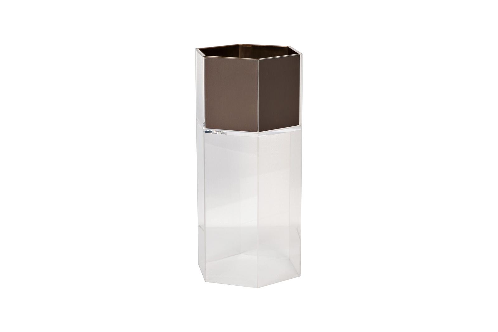 description-full - Современное напольное кашпо из акрила и бронзы — часть коллекции, в которую входят модели разной высоты. Их удобно комбинировать, формируя выразительные вертикали и расставляя акценты. Чёткая геометрия, лаконичные линии и контраст гладких поверхностей подчёркивают актуальность формы. Кашпо уместно в интерьерах в стиле нео-лофт, минимализм или контемпорари — от холла до террасы, где важна чистота архитектурного языка и сдержанная декоративность.
