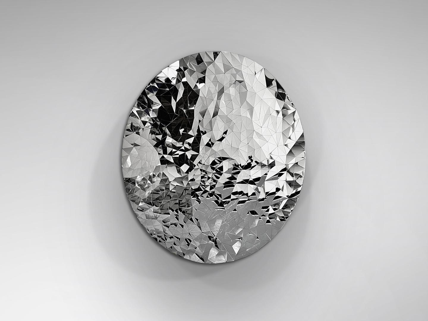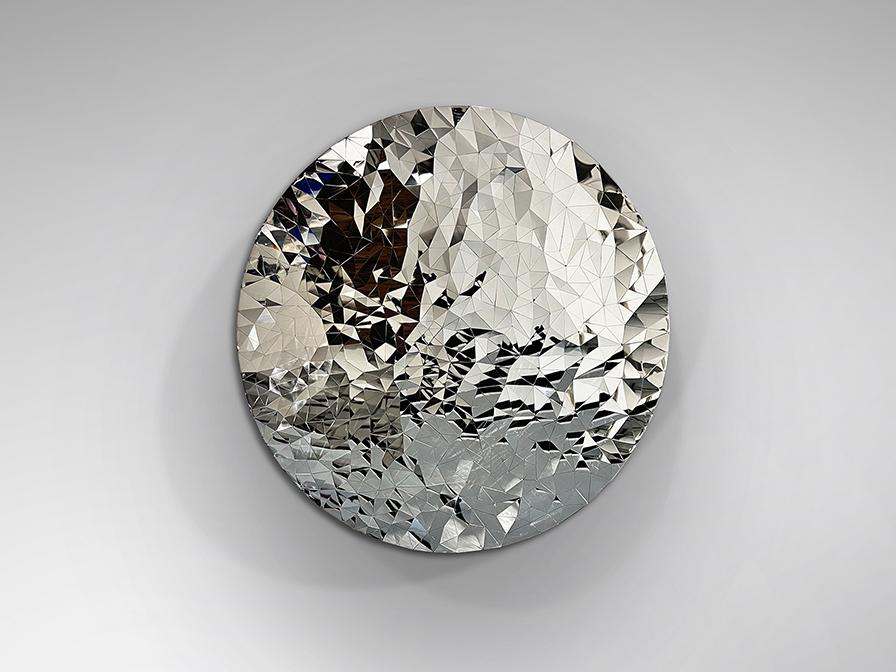 Барельеф из листов нержавеющей стали, образующих сферическую сетку неправильных многогранников. Отделка хромированная.