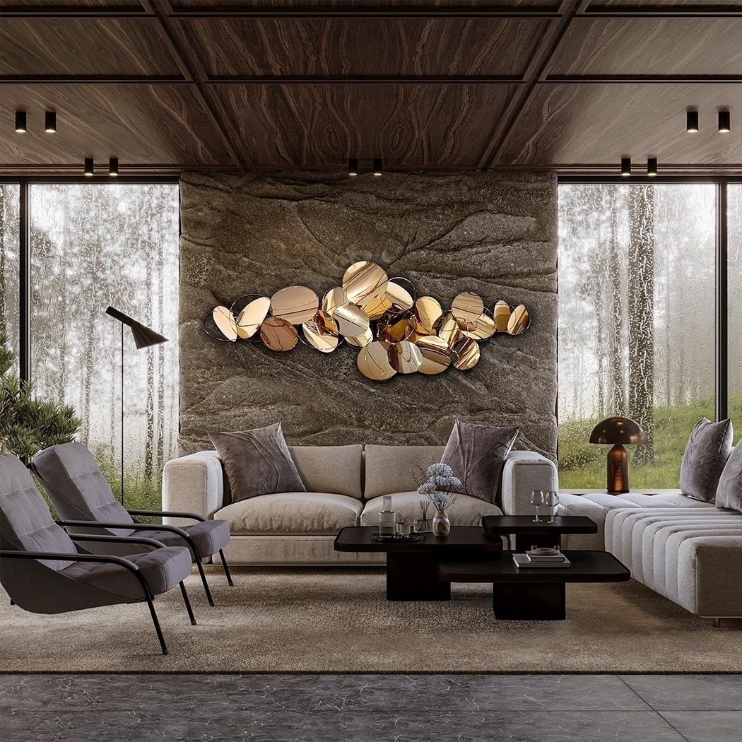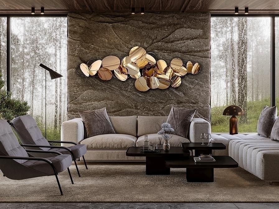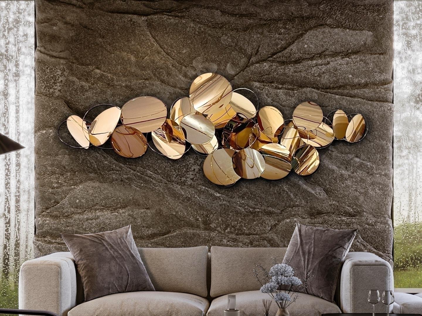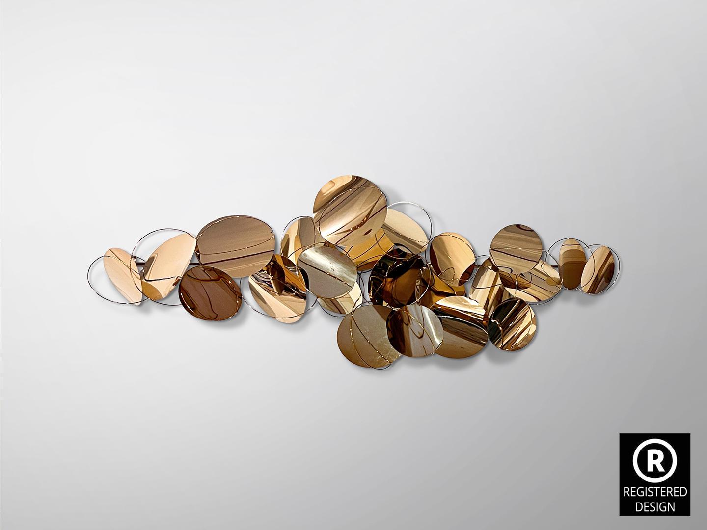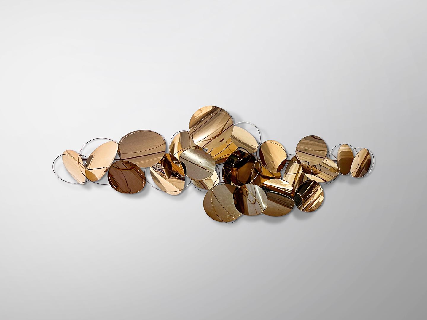 Настенная скульптура, выполненная из сферических листов и стержней из нержавеющей стали. Блестящая отделка из розового золота. Готова к подвешиванию в горизонтальном или вертикальном положении.