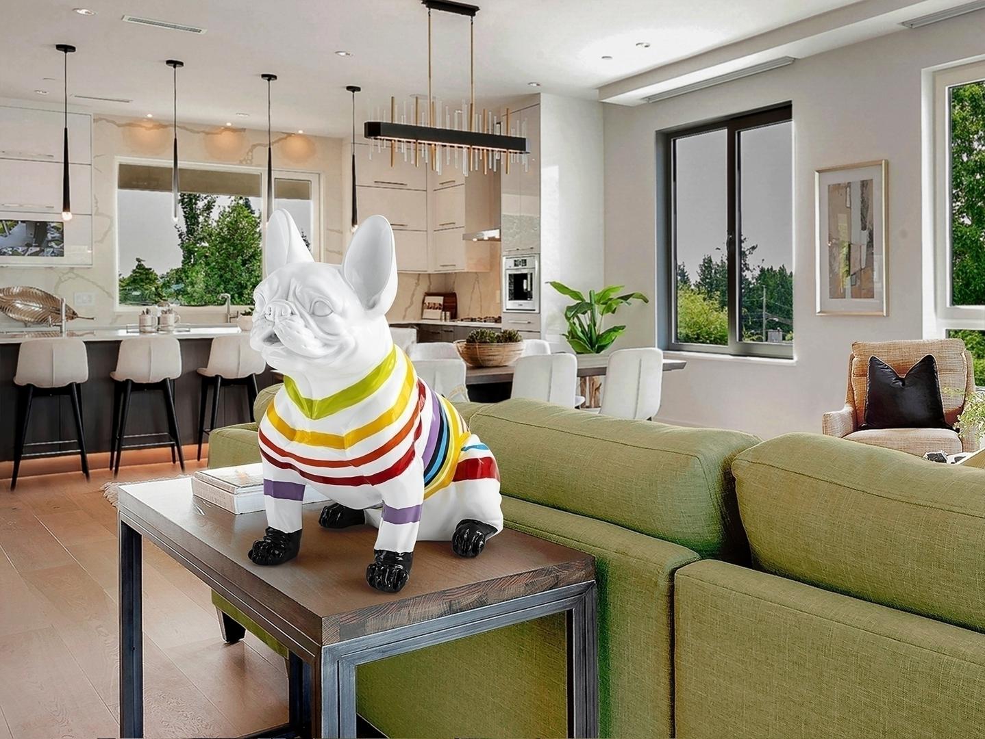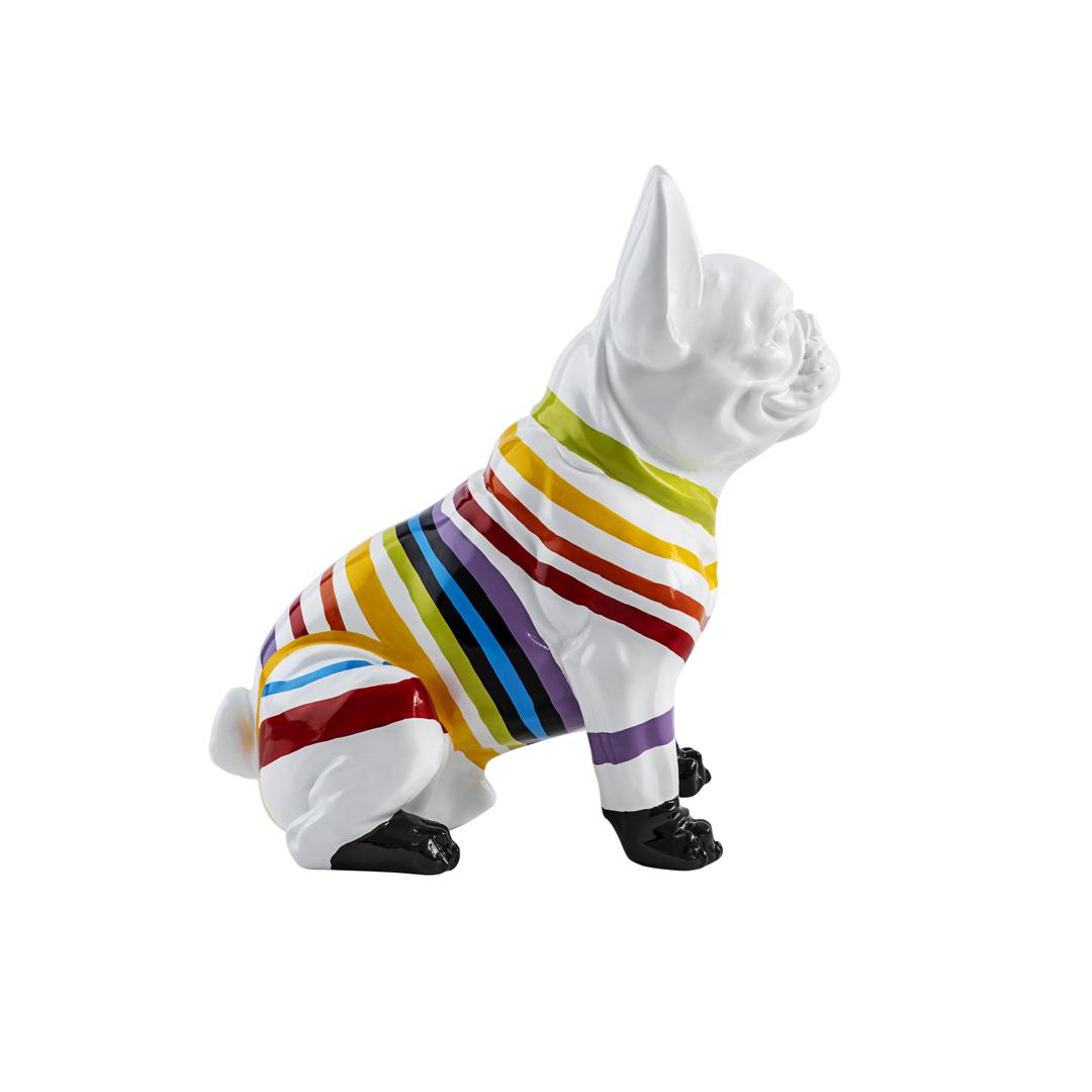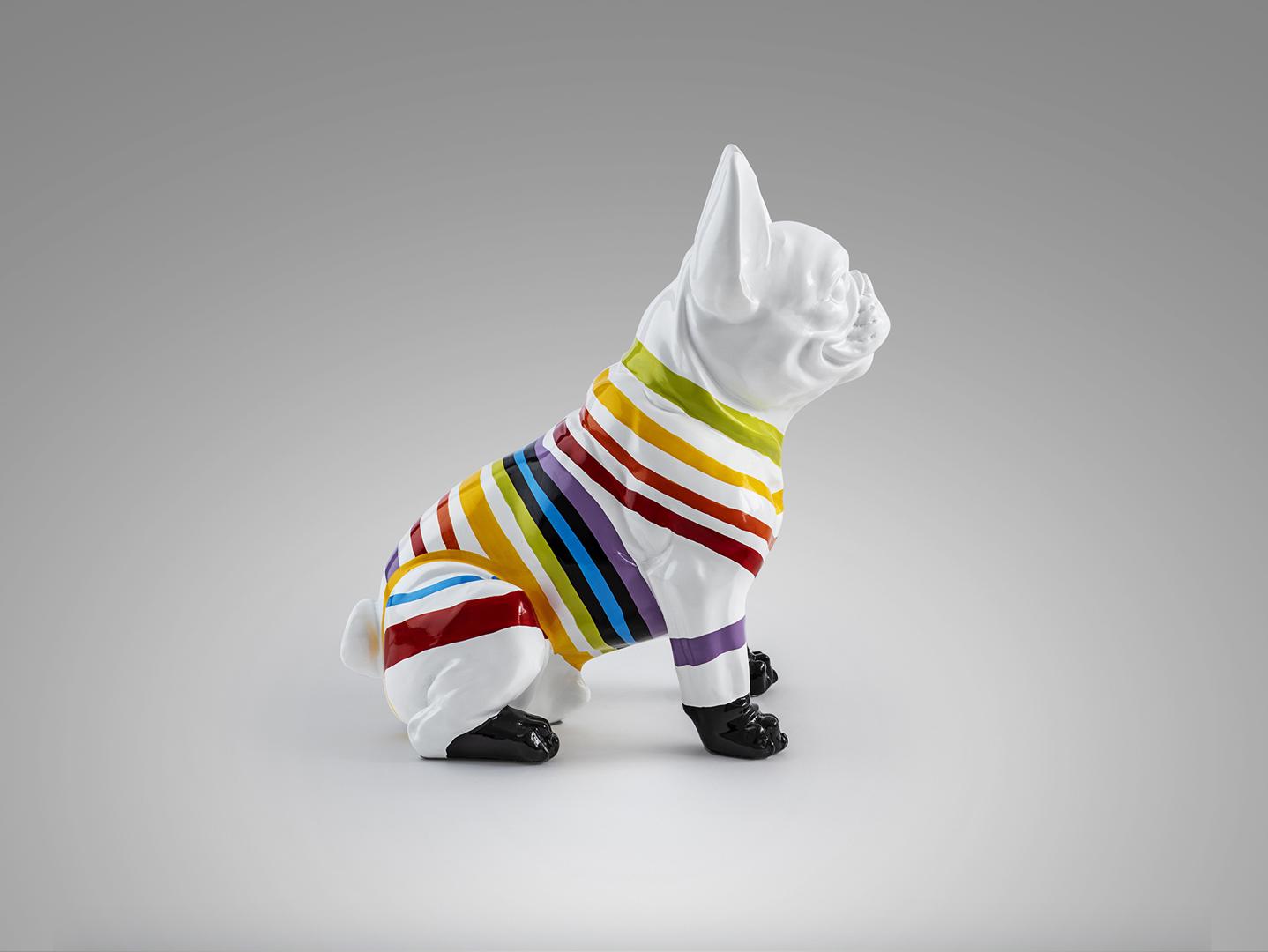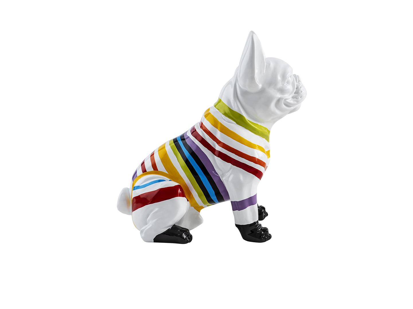 Фигурка французского бульдога небольшого размера, изготовлена из смолы. Оформление: Белая краска с цветными полосками.