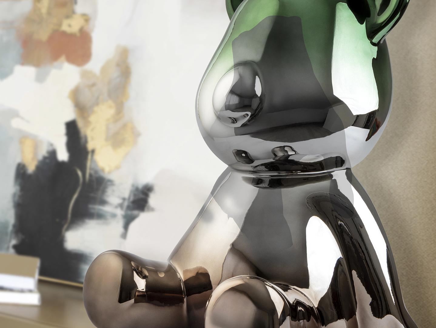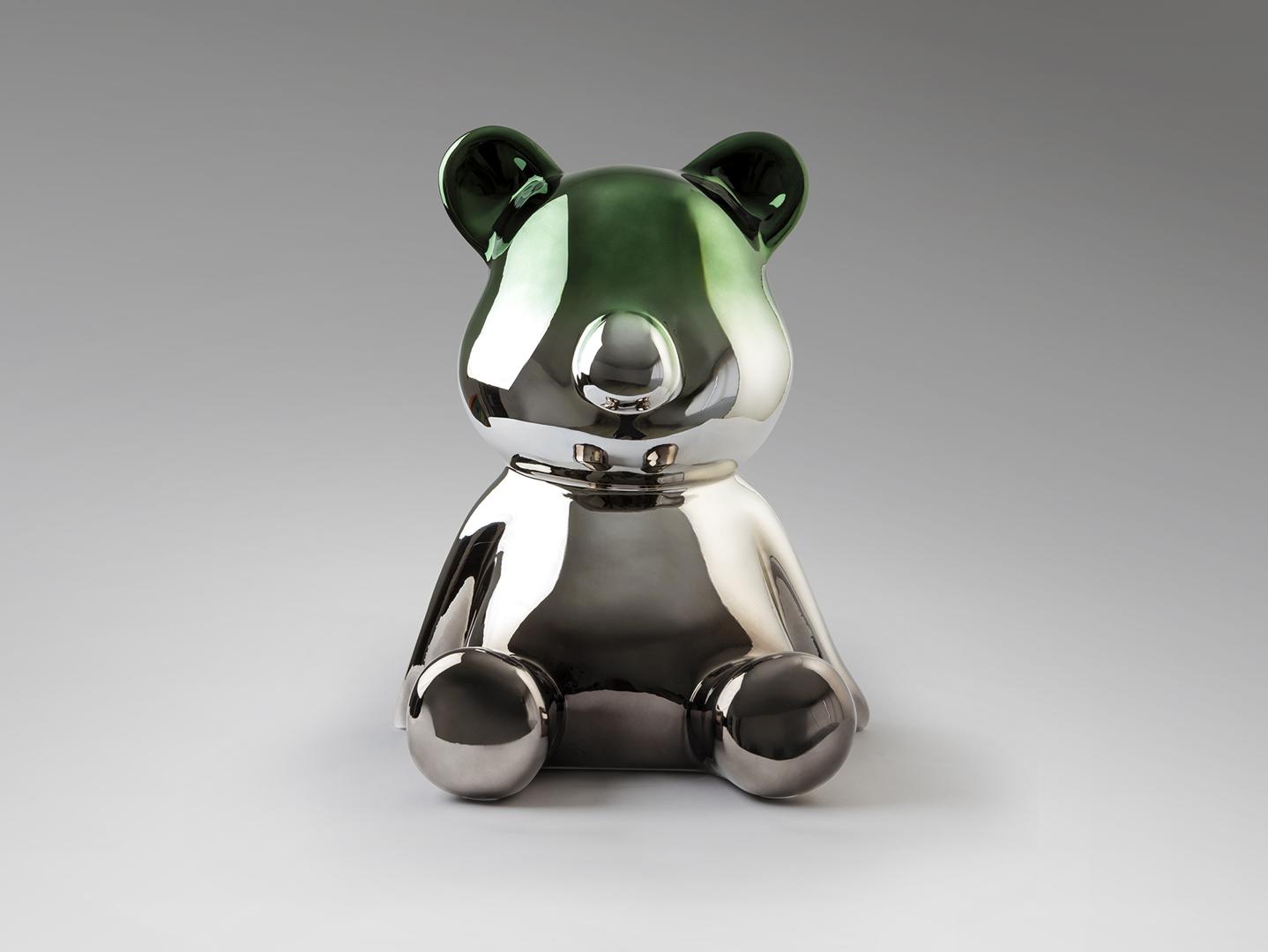 Круглая фигурка медведя, среднего размера. Изготовлена из смолы, металлизированная, с градиентным покрытием от свинцово-серого до зелёного цвета.