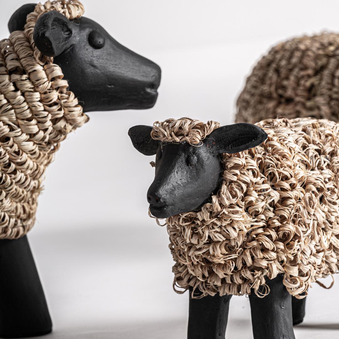 Фигурка животного j/3 Reva в деревенском стиле, выполнена из черной терракоты с матовой отделкой в сочетании с бежевой рафией с отделкой ручной работы. БОЛЬШОЙ Ширина: 40 см, Глубина: 21 см, Высота: 27 см СРЕДНИЙ Ширина: 35 см, Глубина: 17 см, Высота: 24 см МАЛЕНЬКИЙ Ширина: 29 см, Глубина: 13 см, Высота: 19 см
