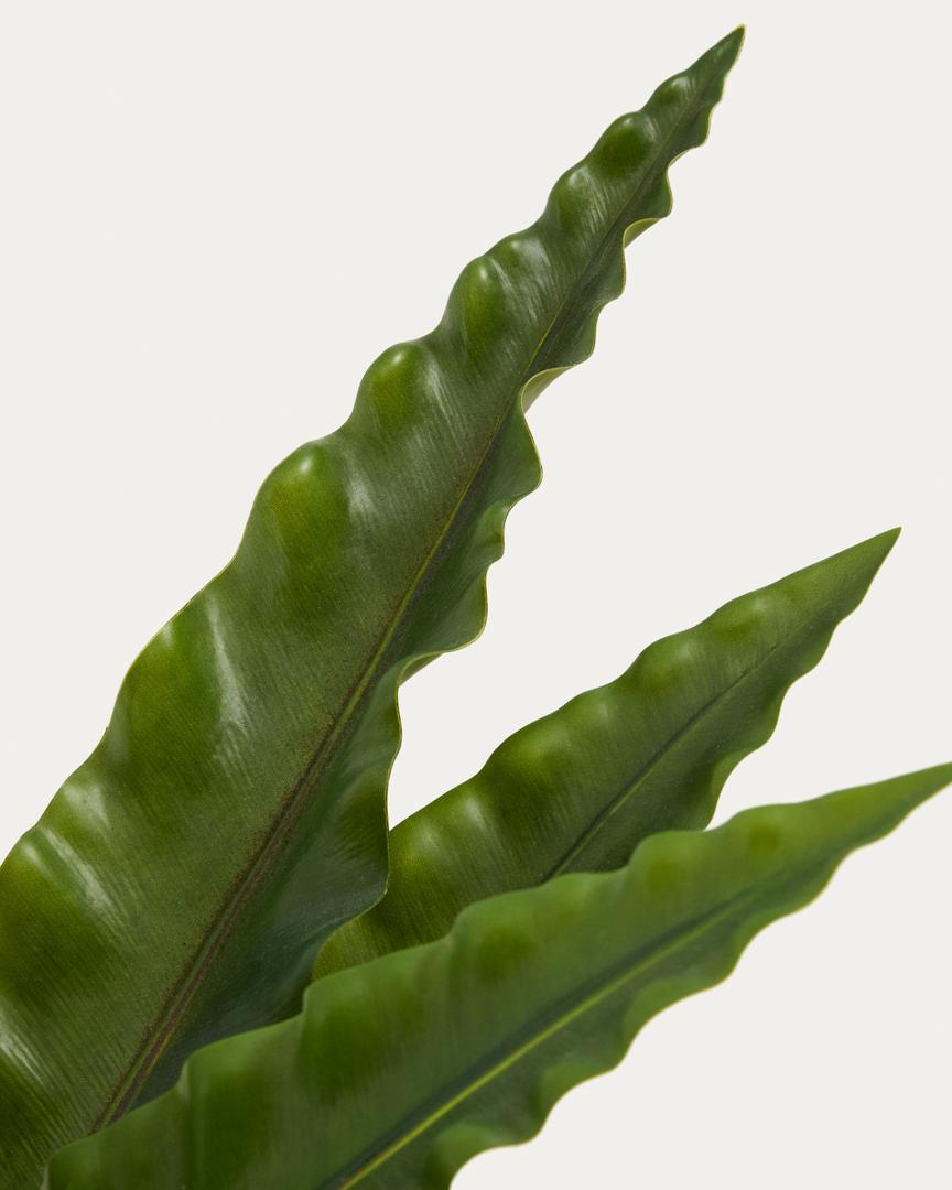 Искусственное растение неоттоптерис воспроизводит типичную форму этого вида с удлиненными, изогнутыми листьями различных оттенков зеленого и выглядит очень реалистично. Оно изготовлено из комбинации ПЭВА, полиэтилена, стали и полипропилена — материалов, обеспечивающих долговечность. Основание содержит песок, цемент и пенопластовый наполнитель для устойчивости. В комплект входит белый цилиндрический горшок для растения, хотя его можно разместить в любом другом декоративном кашпо. Уход прост и требует лишь периодического обслуживания.