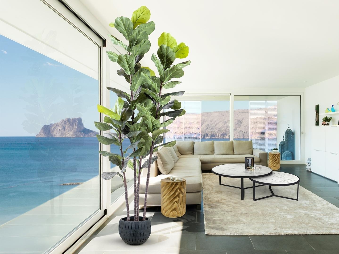 Фикус лировидный (фикус скрипичный), искусственное растение из ПВХ и металла. В комплекте цементное основание с искусственным мхом и горшок (Ø25 x 20 см).