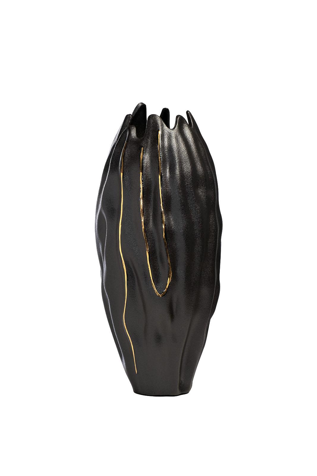 description-full - Рельефная керамическая ваза в абстрактном дизайне с вкраплением золотых линий смотрится особенно изящно. Дизайн напоминает застывшую лаву с золотыми прожилками. Даже скромные полевые цветы будут выглядеть роскошно в чёрной керамической вазе от Garda Decor. Искусно декорированная ваза станет оригинальным украшением интерьера современной комнаты. Красивая керамическая ваза слово произведение интерьерного искусства. К ней хочется прикоснуться и рассмотреть оригинальную форму, фактуру и дизайн. Такая ваза – прекрасный подарок себе, друзьям, коллегам или родственникам, людям, чьи вкусы вы разделяете.