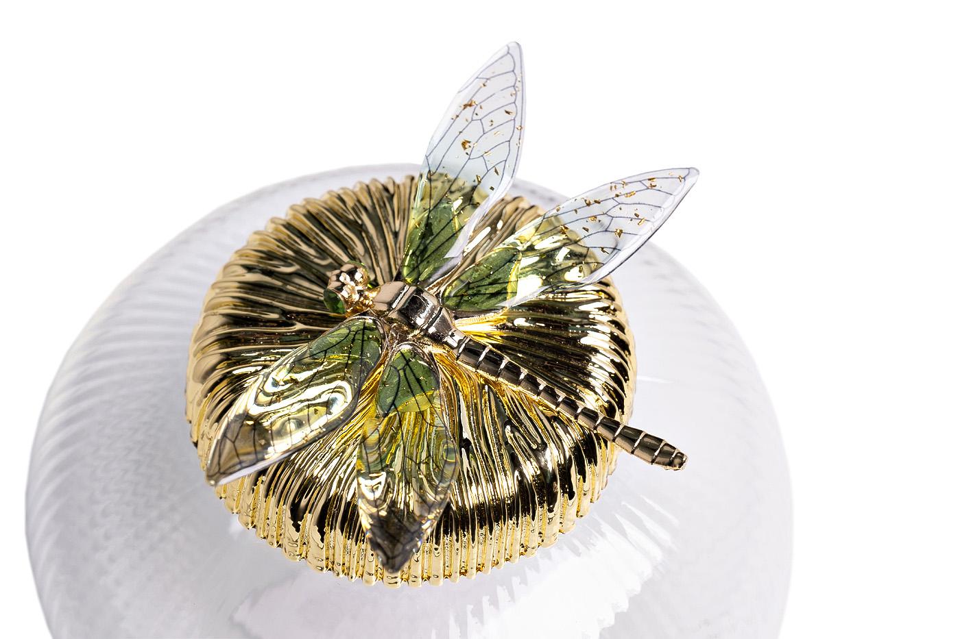 description-full - Сделать домашнее пространство завершённым и запоминающимся порой может одна маленькая деталь, например, декоративная ваза для интерьера. Небольшая и очень стильная стеклянная ваза с крышкой украшена позолотой и миниатюрной стрекозой с прозрачными крыльями. Такое изделие напоминает настоящее произведение искусства и однозначно станет стильным декором в комнате. Стеклянная ваза-банка может выступать как в качестве самостоятельного украшения, так и использоваться для хранения драгоценностей, сладостей или создания декоративной композиции из цветов или необычных камней.