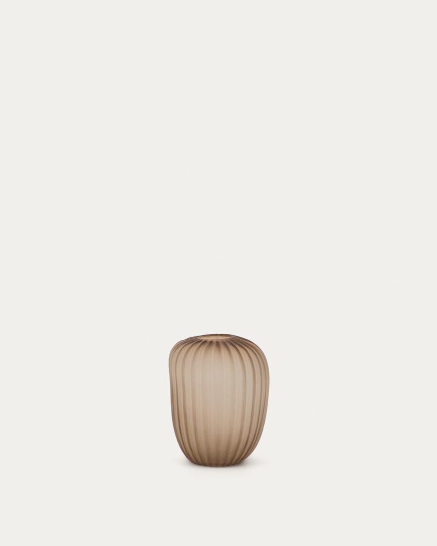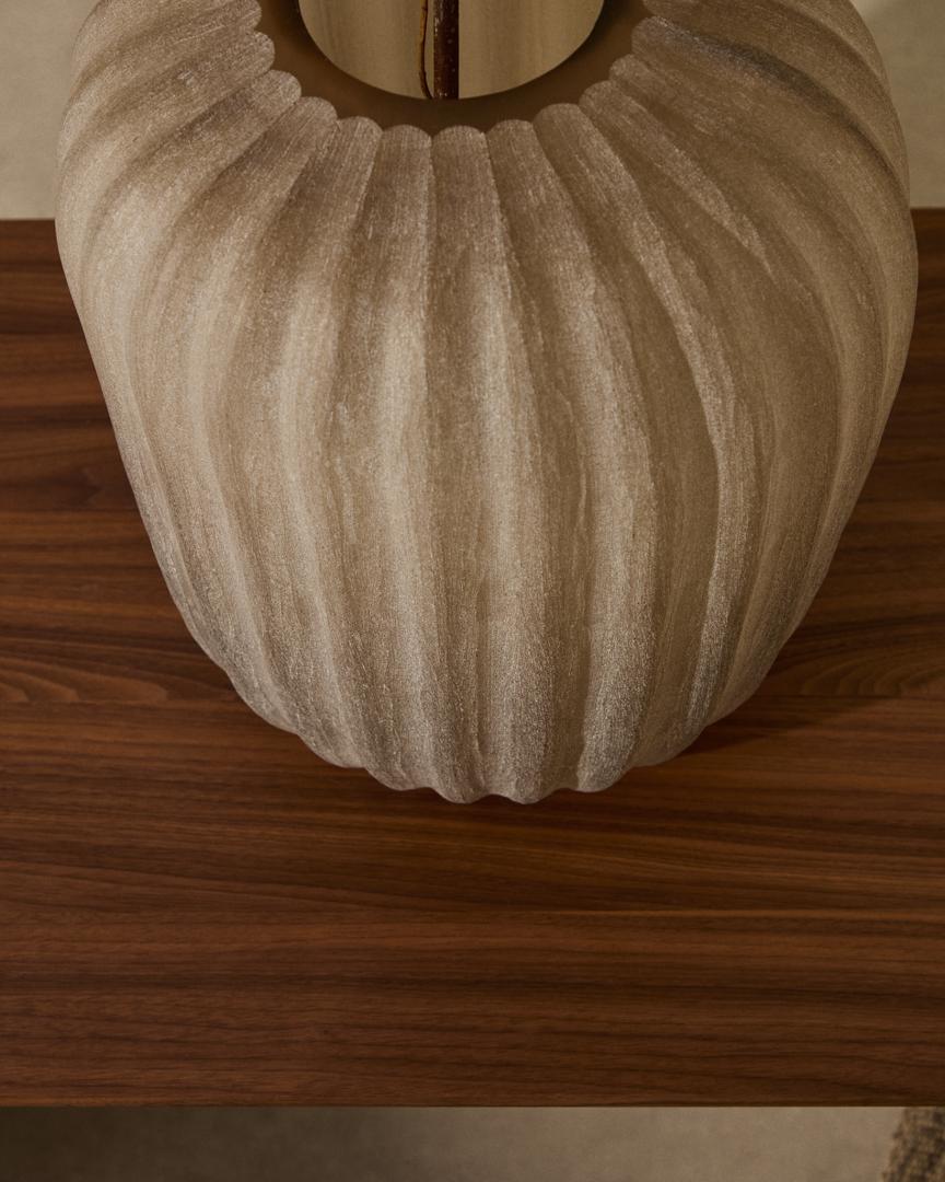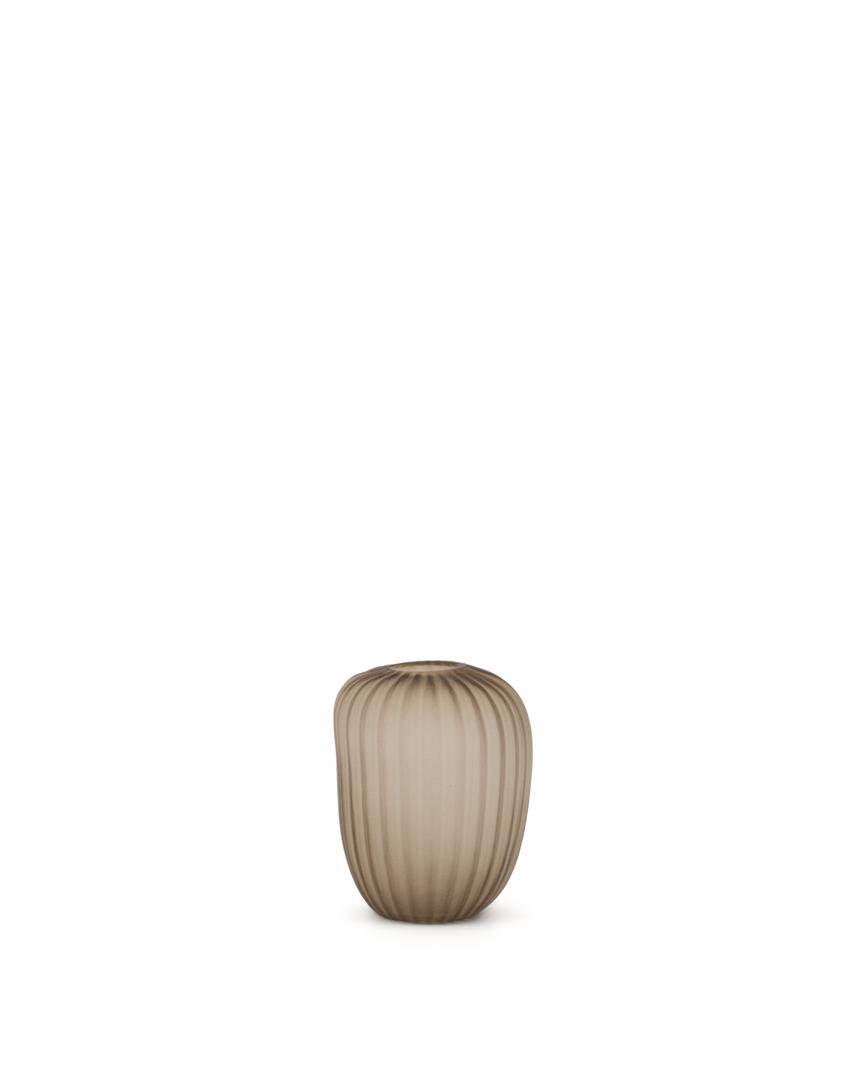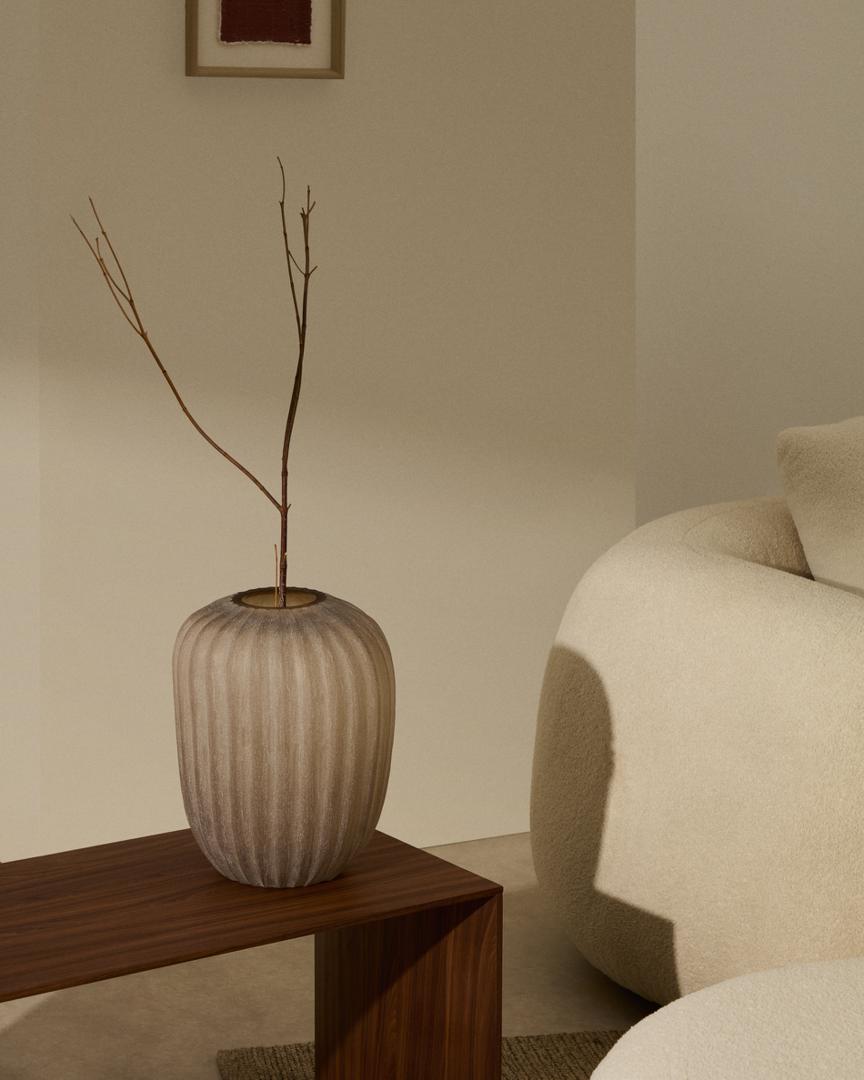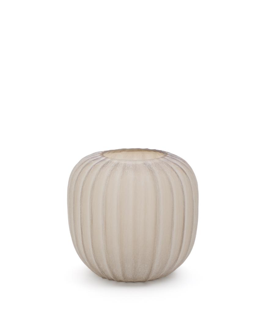 Эта стеклянная ваза выделяется тонкими вертикальными линиями, которые придают ей элегантность и симметричность. Дымчато-бежевый оттенок и вытянутая форма делают её изысканным предметом, идеально подходящим для утончённой и тёплой обстановки.