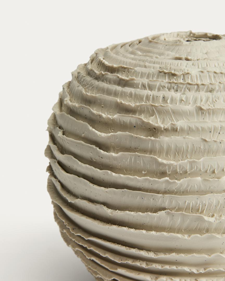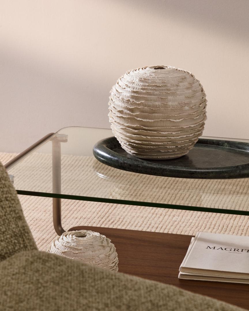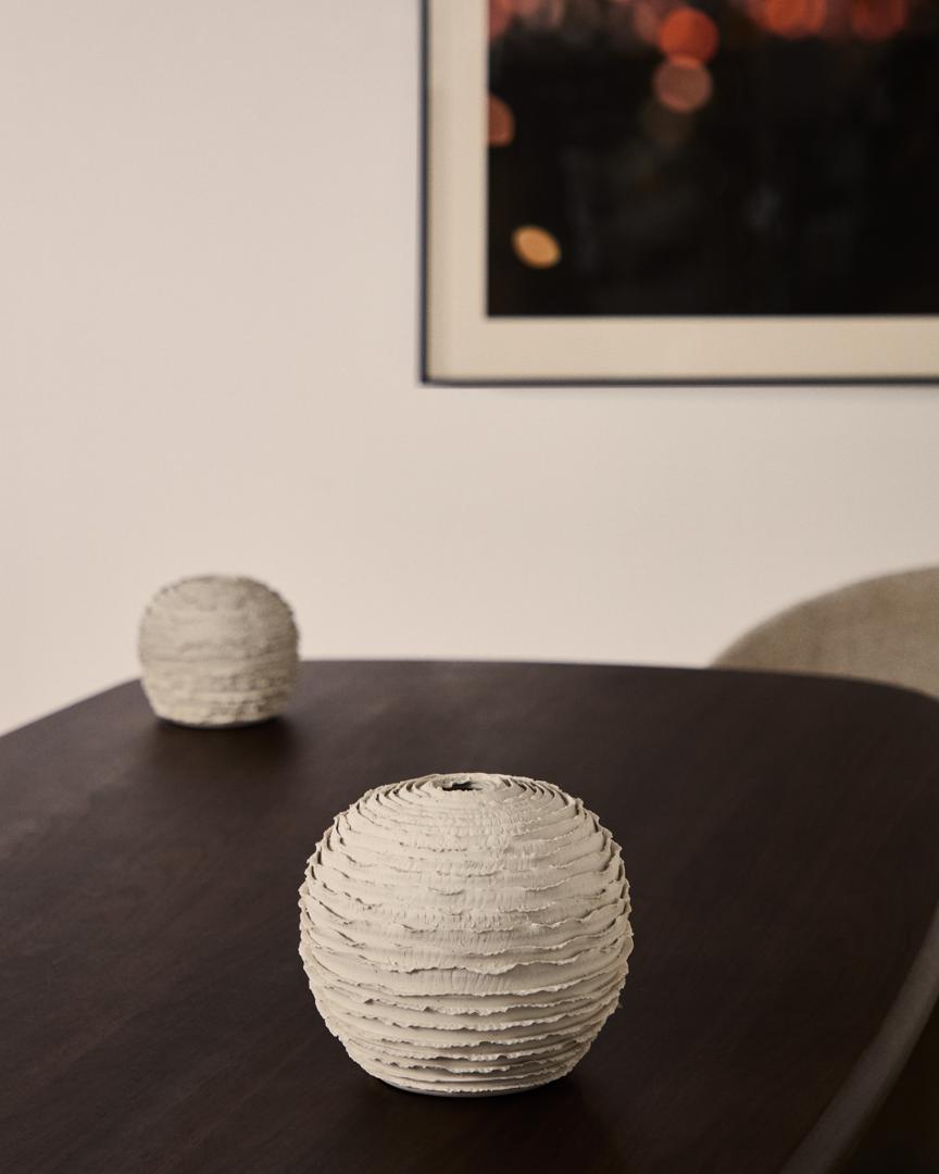 Коллекция Evania изготавливается вручную на гончарном круге, что придает каждому предмету индивидуальность и делает его поистине уникальным. Поверхность украшена изящными горизонтальными бороздками, огибая вазу, создавая тонкую игру теней и текстур, которая добавляет ей аутентичности и очарования. Её округлые, органичные формы создают атмосферу спокойствия и визуального равновесия в любом интерьере. Эта ваза – как самостоятельный предмет интерьера, так и для хранения сухих цветов – станет универсальным и вневременным декоративным элементом.