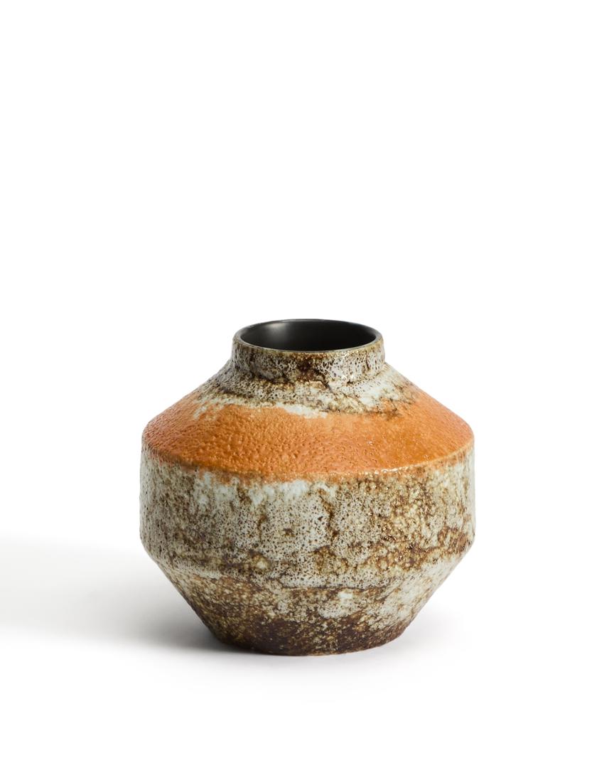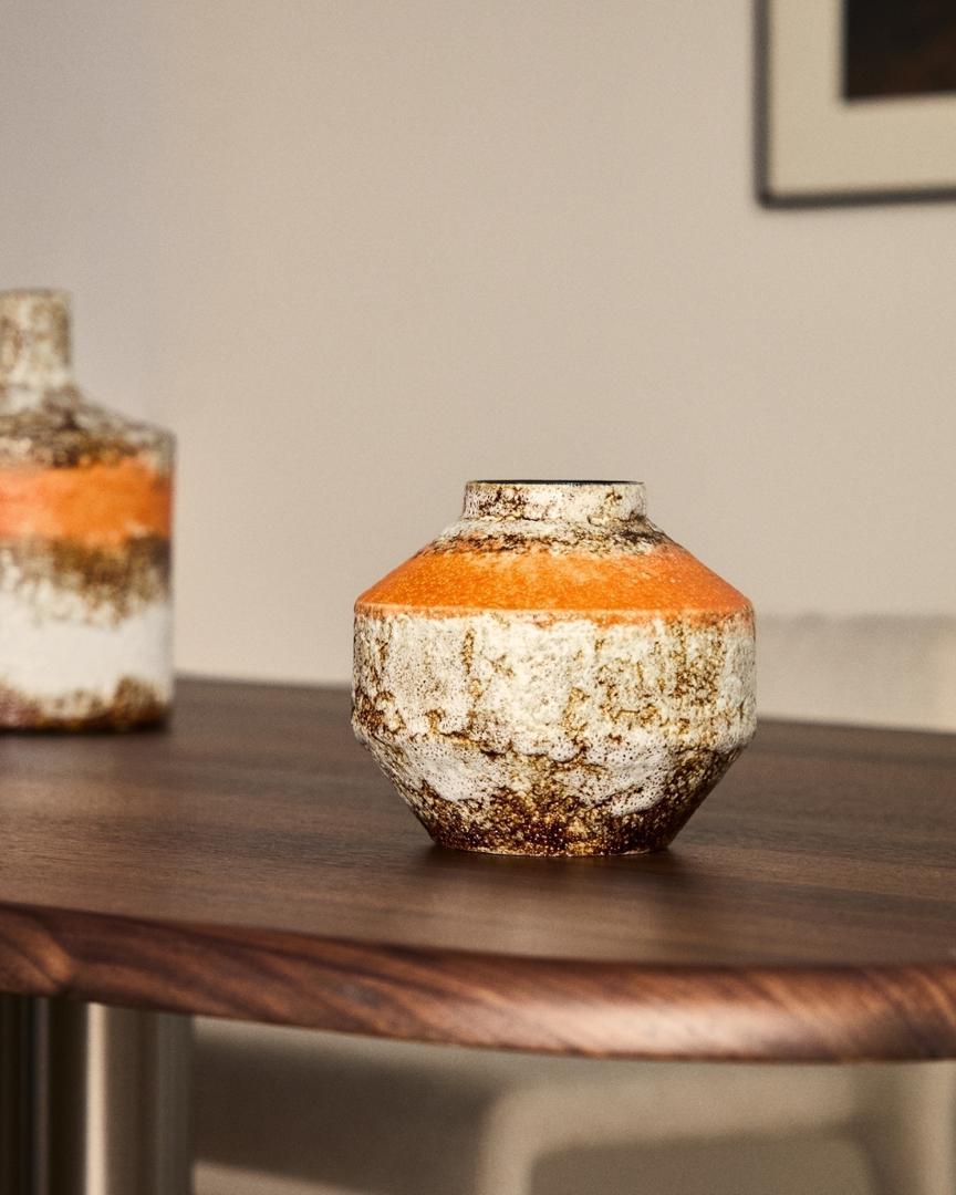Каждый предмет коллекции Estin изготавливается вручную, что гарантирует уникальность. Процесс глазурования создаёт уникальные оттенки и текстуры на поверхности. Геометрический силуэт и чёткие линии подчёркиваются сочетанием землистых тонов и тёплого оранжевого, создавая тонкий, но изысканный контраст. Эта ваза идеально подходит для подсветки стола, полки или консоли, добавляя декоративной ценности как отдельно, так и в сочетании с сухоцветами или ветками.