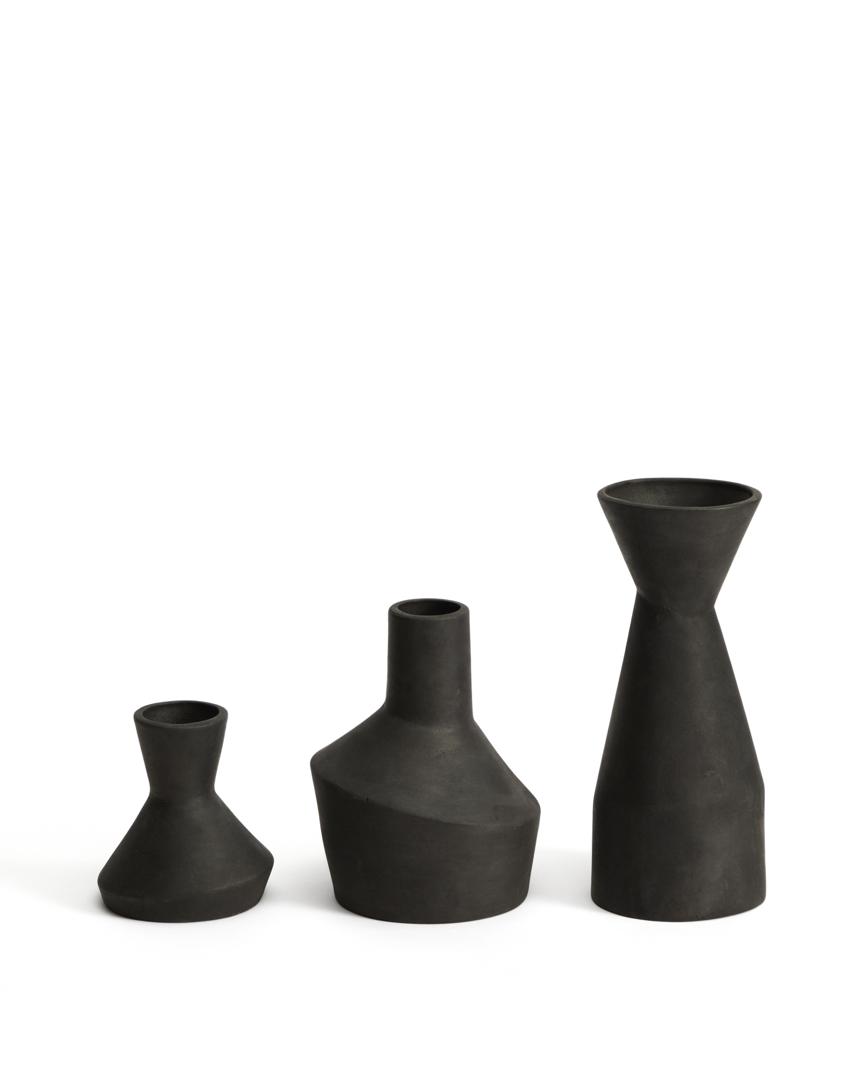 Набор из трёх чёрных терракотовых ваз. Каждая вазочка уникальна и имеет свой неповторимый оттенок, обусловленный природой материала.