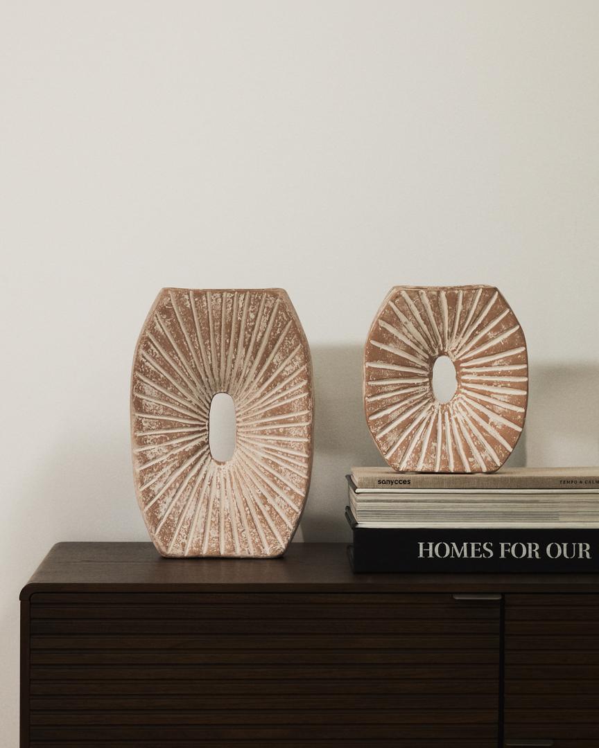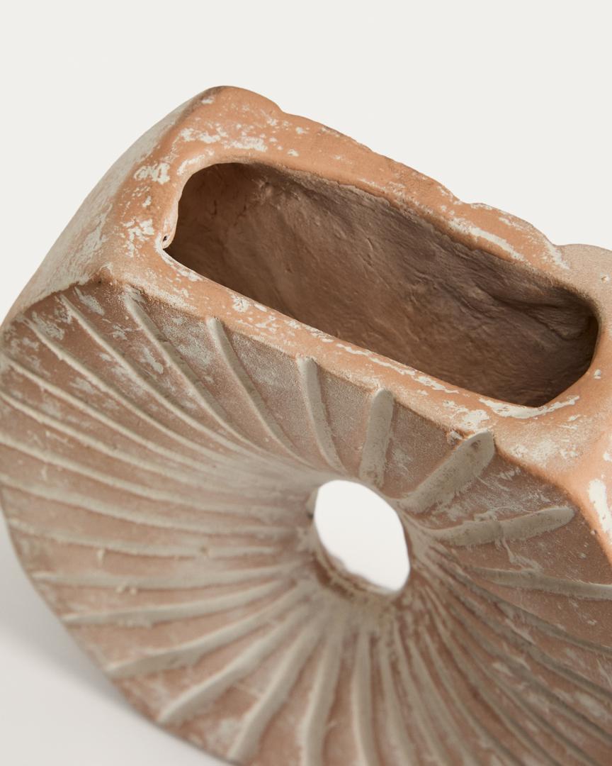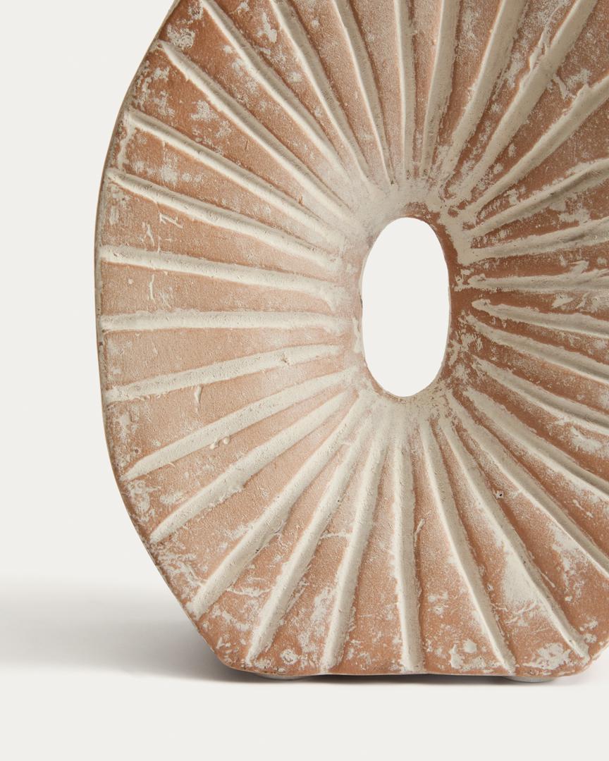 Эта ваза из папье-маше – скульптурное произведение с эффектом состаривания. Её дизайн с радиальными линиями и центральным отверстием привнесёт индивидуальность и неповторимость в любое пространство. Каждая ваза уникальна, с тонкими вариациями цвета и отделки, обусловленными природой материала и технологией изготовления. Декоративный предмет для тех, кто ценит аутентичность и оригинальность.