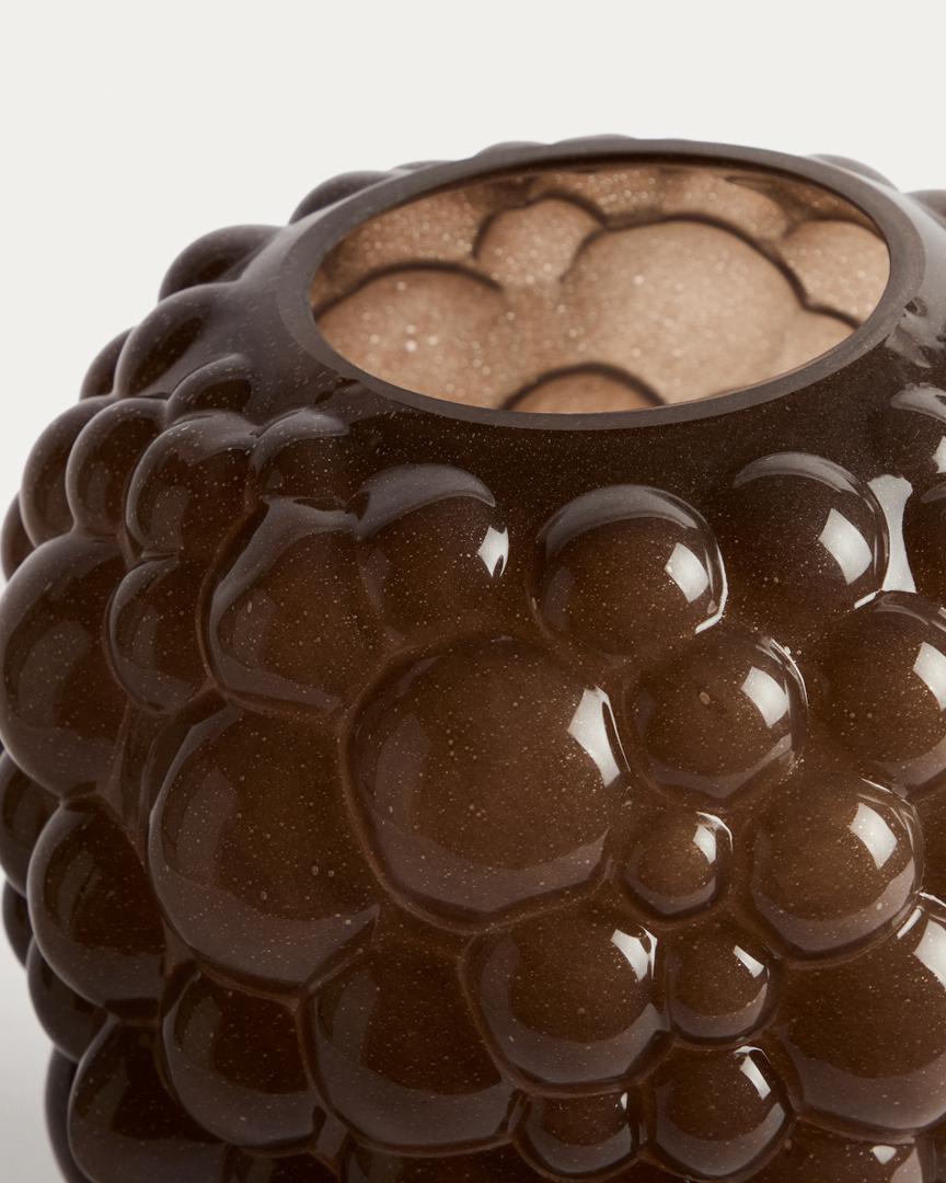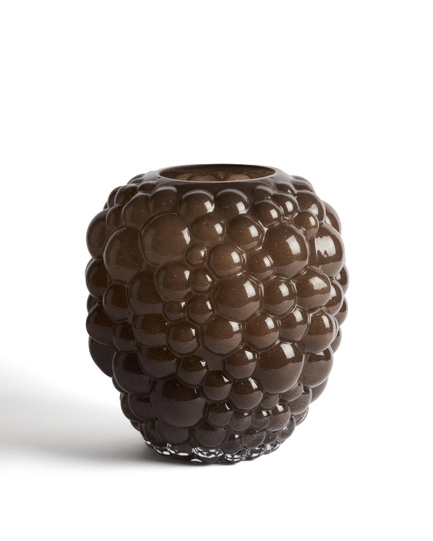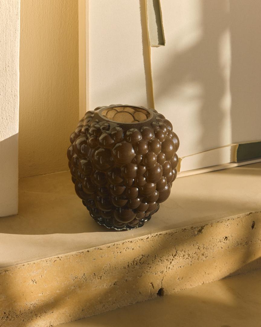 Ваза Mure выделяется своими округлыми рельефами, создающими скульптурный эффект. Это декоративный элемент, обладающий выразительностью и текстурой, который придаёт характер обстановке. Она изготовлена из стекла, окрашенного методом массового тонирования, — технологии, при которой цвет вводится непосредственно в материал, что обеспечивает равномерный и стойкий оттенок.