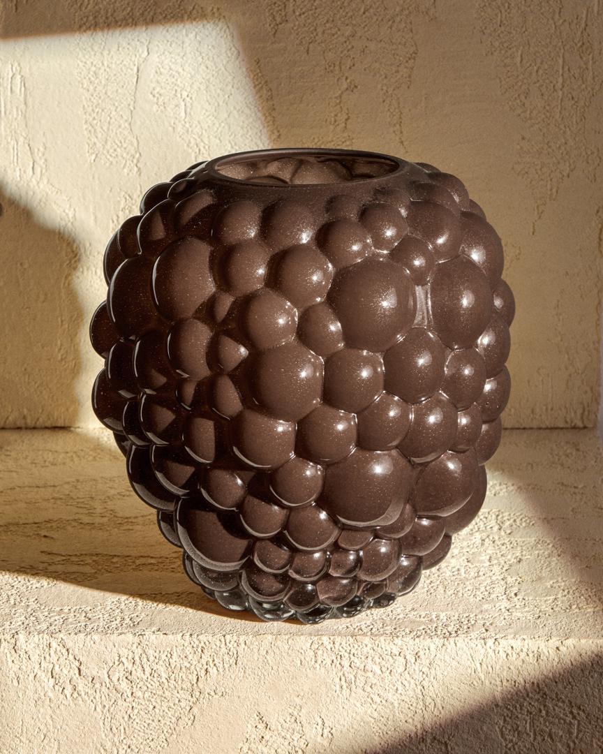 Ваза Mure выделяется своими округлыми рельефами, создающими скульптурный эффект. Это декоративный элемент, обладающий выразительностью и текстурой, который придаёт характер обстановке. Она изготовлена из стекла, окрашенного методом массового тонирования, — технологии, при которой цвет вводится непосредственно в материал, что обеспечивает равномерный и стойкий оттенок.
