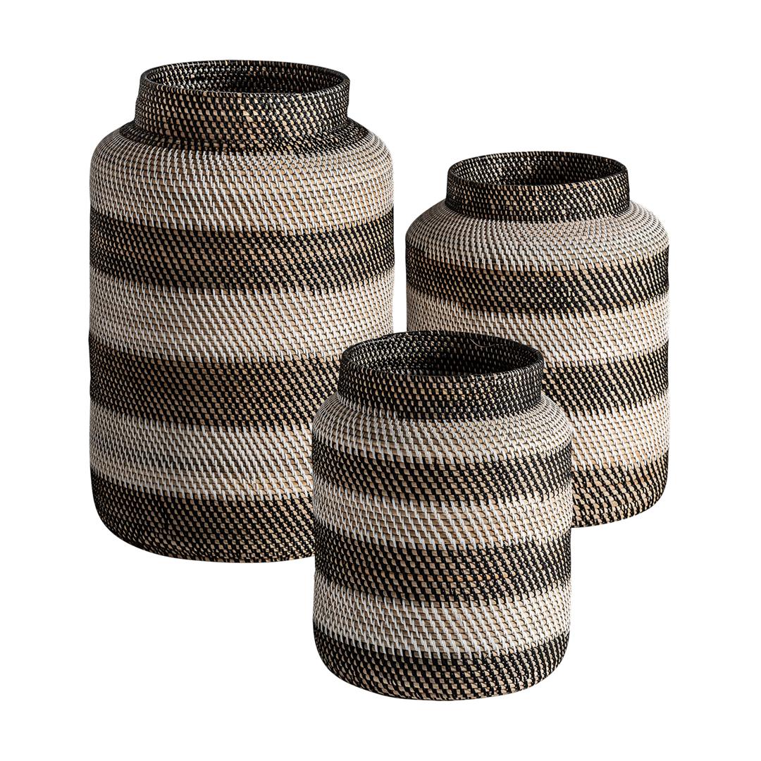 Набор ваз ZIRBA от фабрики Vical — этнический стиль, созданный из ротанга. Набор ваз ZIRBA - отличное решение для оформления вашей гостиной. Полосатый принт на фоне однотонной стены будет смотреться ярко и стильно. А натуральный ротанг определит эко-формат и соответстветствие трендам. Вазы имеют баночную форму с широкой горловиной. Они полностью сделаны из ротанга двух видов, имеют естественный цвет, плетеную фактуру. Вазы созданы исключительно для декоративной роли. Композицию можно дополнять сухоцветами. Вазы требуют деликатного ухода - только ручная чистка без абразивов. Ротанг - стойкий к ультрафиолету и влажности материал. Поэтому вазы можно выставлять на террасе, использовать для декора сада в летнее время