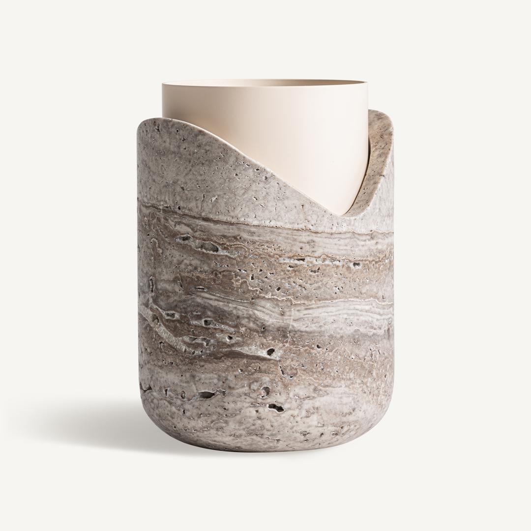Ваза Daye в стиле ар-деко, выполнена из бежевого мрамора в сочетании с кремовой сталью. Изделие разборное. Ширина: 15 см, Глубина: 15 см, Высота: 22 см