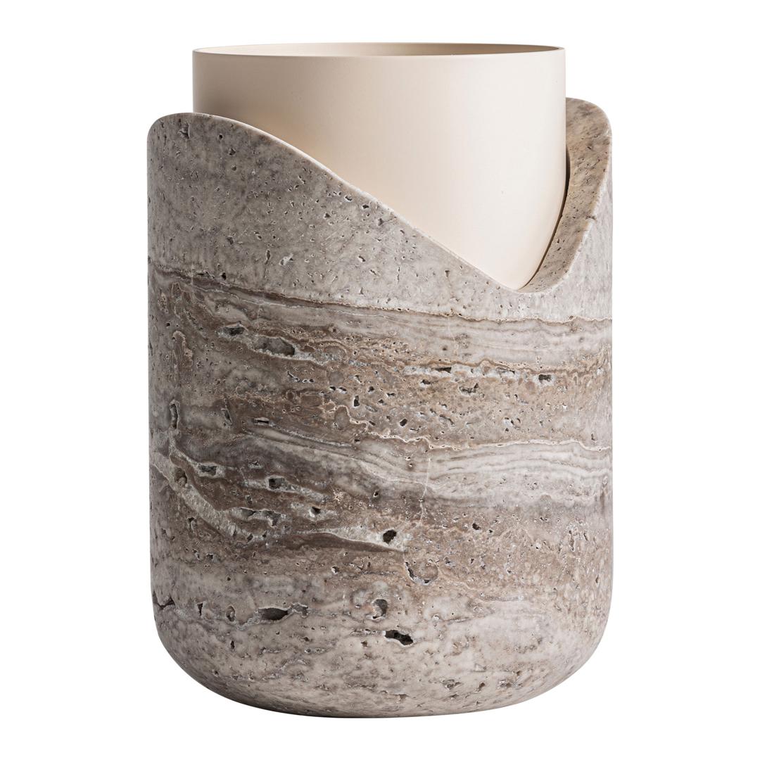 Ваза Daye в стиле ар-деко, выполнена из бежевого мрамора в сочетании с кремовой сталью. Изделие разборное. Ширина: 15 см, Глубина: 15 см, Высота: 22 см