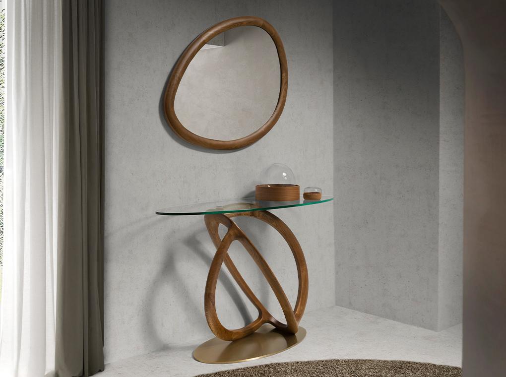 Настенное зеркало современного дизайна из органического материала в деревянной раме орехового цвета. Это горизонтальное зеркало идеально подходит для создания элегантной и авангардной атмосферы, создавая ощущение простора и света.
