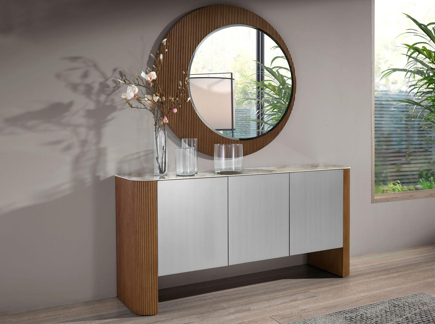 Круглое настенное зеркало 3262/MIR23067 от фабрики Angel Cerda – лаконичный вид и прекрасная древесина. Настенное зеркало 3262/MIR23067 идеально подходит для создания элегантной и авангардной атмосферы, создает ощущение простора и яркости. Его простая геометрия формы легко адаптируется под любую нишу или место на стене. А идеальная рама из ореха – украшение для интерьера. Зеркало имеет круглую форму. Оно состоит из деревянной рамы и стекла с зеркальным покрытием. Рама имеет фактурную рифленую поверхность, что придает общему виду дополнительный объем и добавляет уникальность. Отражение без визуальных эффектов и затемнений. Для чистки поверхности необходимо использовать мягкие моющие средства. Размеры: ширина – 110 см, высота – 110 см, глубина – 3 см. Вес – 19 кг. Крепеж для подвеса включен в комплектацию. Зеркало предназначено для эксплуатации только в помещениях с нормальным уровнем влажности.