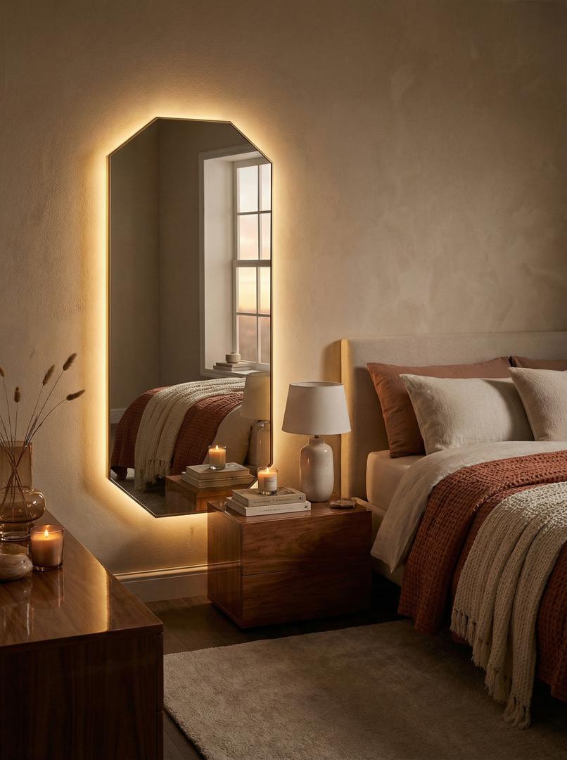 Зеркало в тонкой раме с интерьерной, фоновой подсветкой, рассотяние от стены всего 9 мм. Премиум лента COB со сплошным свечением, встроенный плоский блок питания 12V с влагозащитой IP67, работа от внешнего выключателя или шнура 220V (идет в комплекте). Температура свечения на выбор 3000K, 4000K, 6000K. Изделия можно использовать в помещениях с повышенной влажностью до 70%. Навешивается вертикально и горизонтально.