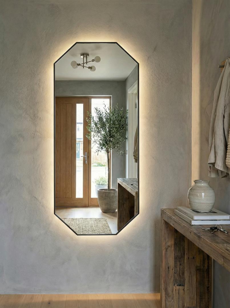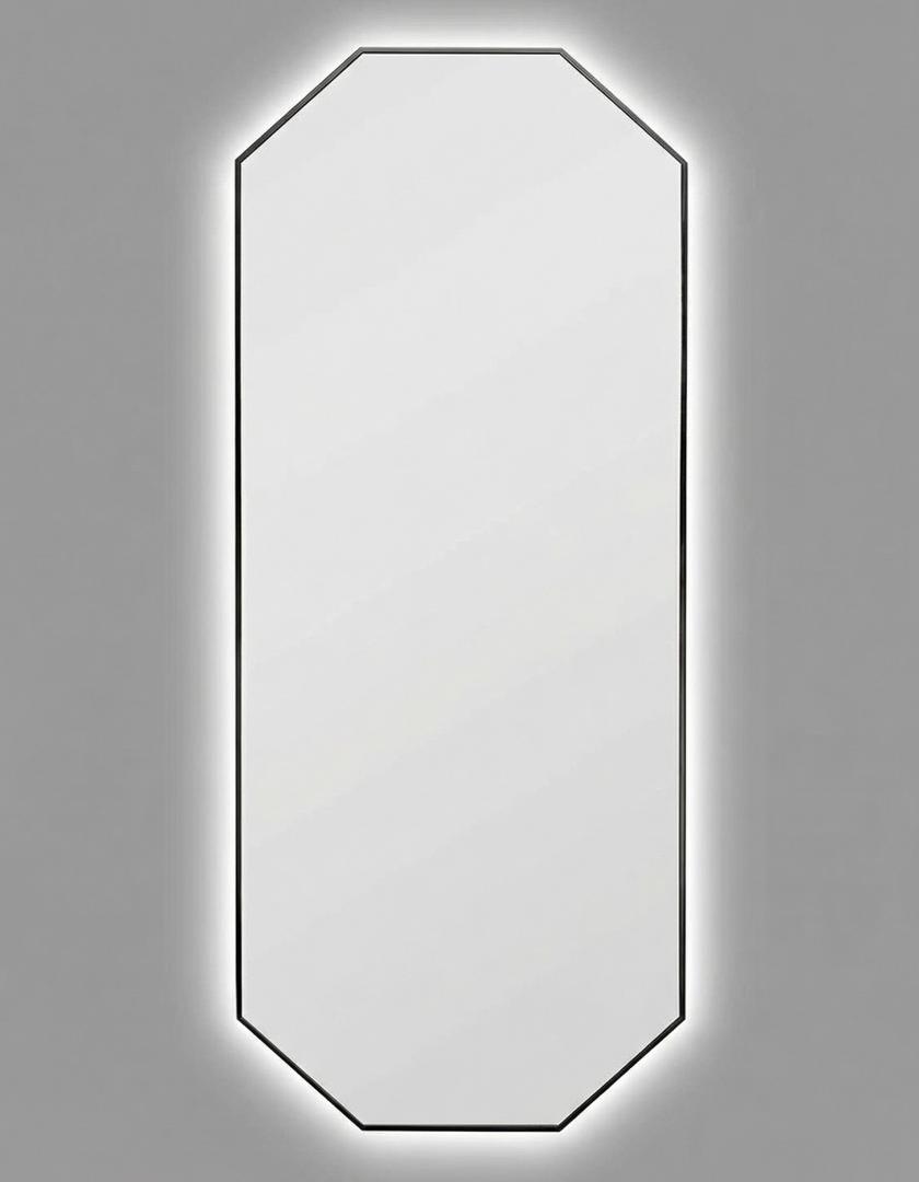 Зеркало в тонкой раме с интерьерной, фоновой подсветкой, рассотяние от стены всего 9 мм. Премиум лента COB со сплошным свечением, встроенный плоский блок питания 12V с влагозащитой IP67, работа от внешнего выключателя или шнура 220V (идет в комплекте). Температура свечения на выбор 3000K, 4000K, 6000K. Изделия можно использовать в помещениях с повышенной влажностью до 70%. Навешивается вертикально и горизонтально.