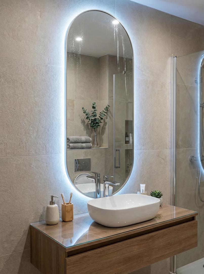 Зеркало в тонкой раме с интерьерной, фоновой подсветкой, рассотяние от стены всего 9 мм. Премиум лента COB со сплошным свечением, встроенный плоский блок питания 12V с влагозащитой IP67, работа от внешнего выключателя или шнура 220V (идет в комплекте). Температура свечения на выбор 3000K, 4000K, 6000K. Изделия можно использовать в помещениях с повышенной влажностью до 70%. Навешивается вертикально и горизонтально.