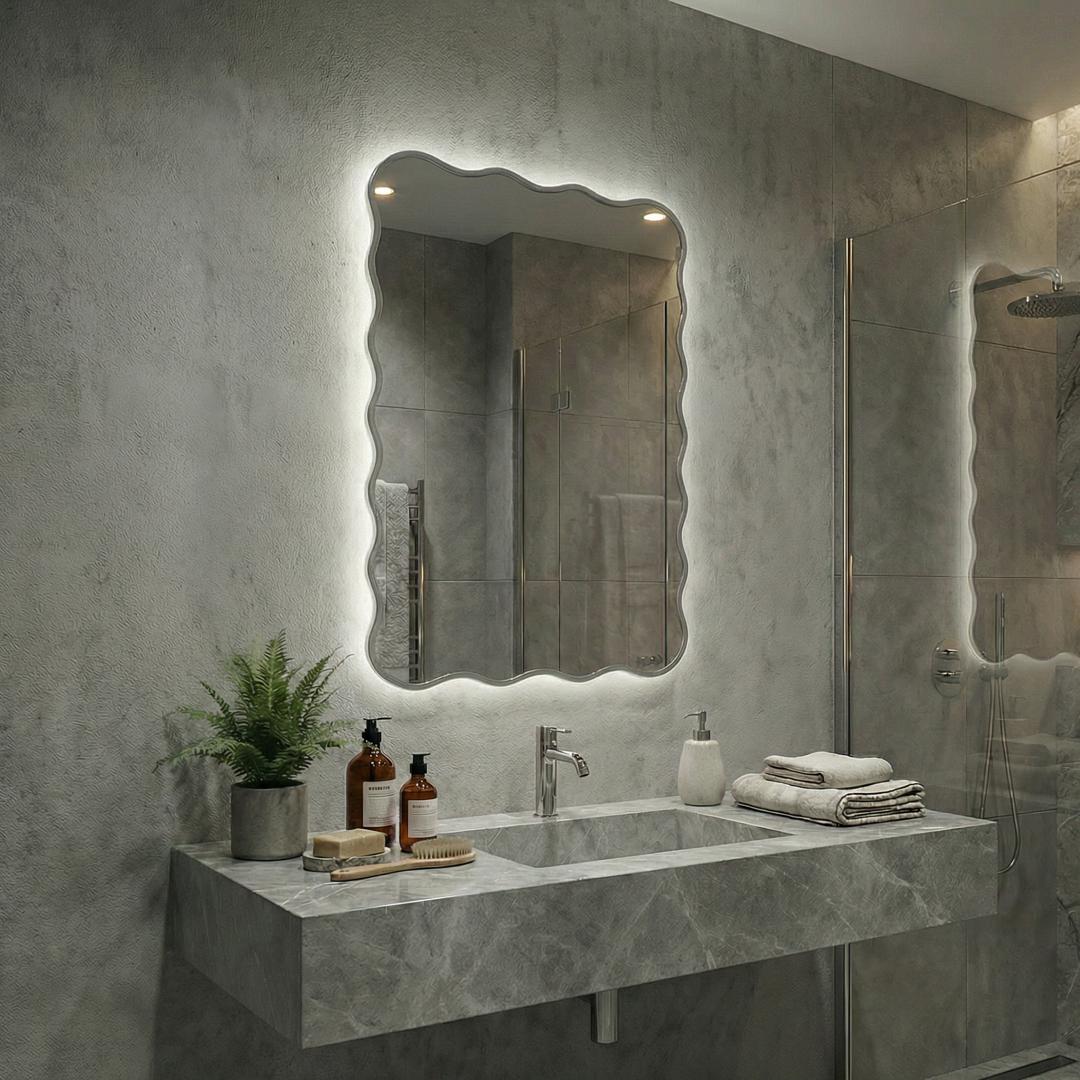 Зеркало в тонкой раме с интерьерной, фоновой подсветкой, рассотяние от стены всего 9 мм. Премиум лента COB со сплошным свечением, встроенный плоский блок питания 12V с влагозащитой IP67, работа от внешнего выключателя или шнура 220V (идет в комплекте). Температура свечения на выбор 3000K, 4000K, 6000K. Изделия можно использовать в помещениях с повышенной влажностью до 70%. Навешивается вертикально и горизонтально.