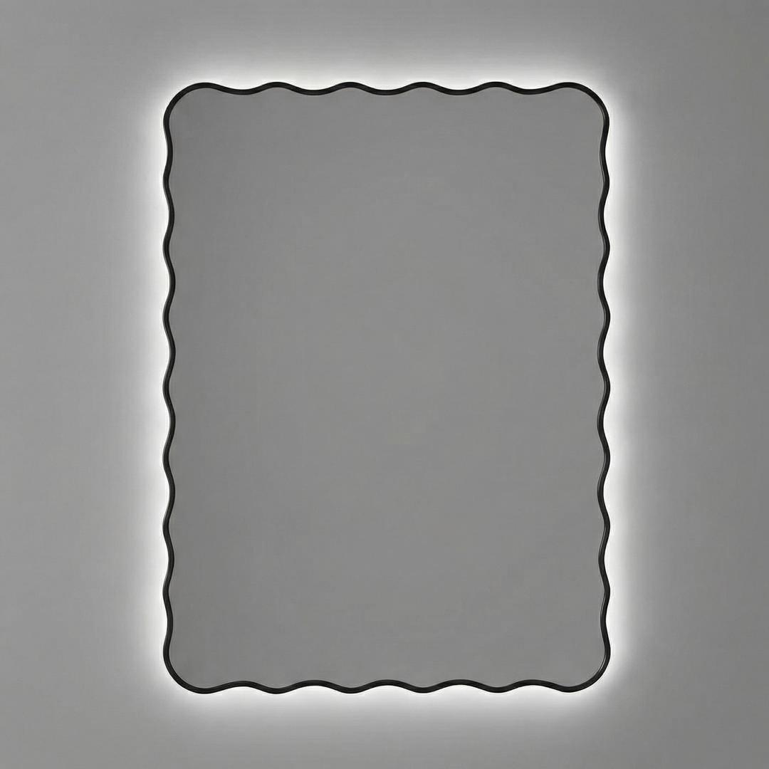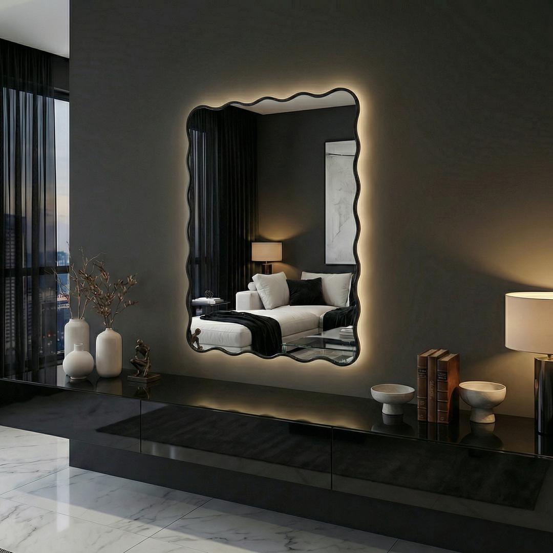 Зеркало в тонкой раме с интерьерной, фоновой подсветкой, рассотяние от стены всего 9 мм. Премиум лента COB со сплошным свечением, встроенный плоский блок питания 12V с влагозащитой IP67, работа от внешнего выключателя или шнура 220V (идет в комплекте). Температура свечения на выбор 3000K, 4000K, 6000K. Изделия можно использовать в помещениях с повышенной влажностью до 70%. Навешивается вертикально и горизонтально.