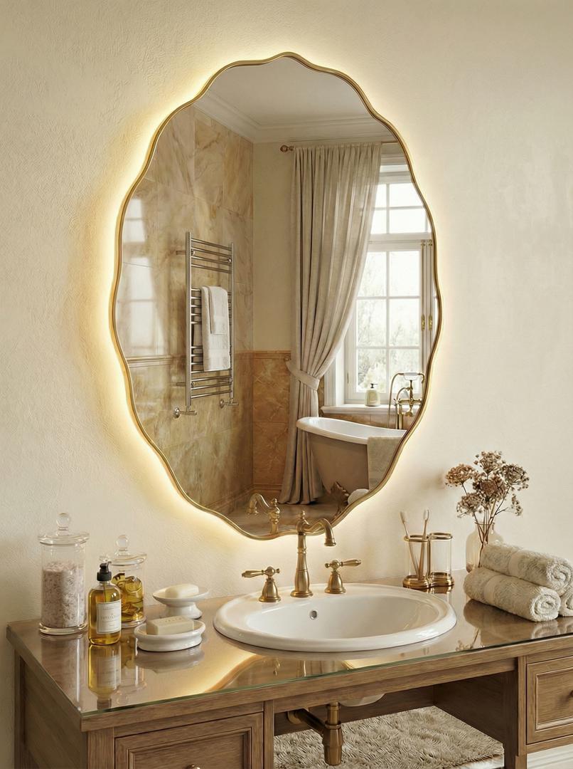 Зеркало в тонкой раме с интерьерной, фоновой подсветкой, рассотяние от стены всего 9 мм. Премиум лента COB со сплошным свечением, встроенный плоский блок питания 12V с влагозащитой IP67, работа от внешнего выключателя или шнура 220V (идет в комплекте). Температура свечения на выбор 3000K, 4000K, 6000K. Изделия можно использовать в помещениях с повышенной влажностью до 70%. Навешивается вертикально и горизонтально.