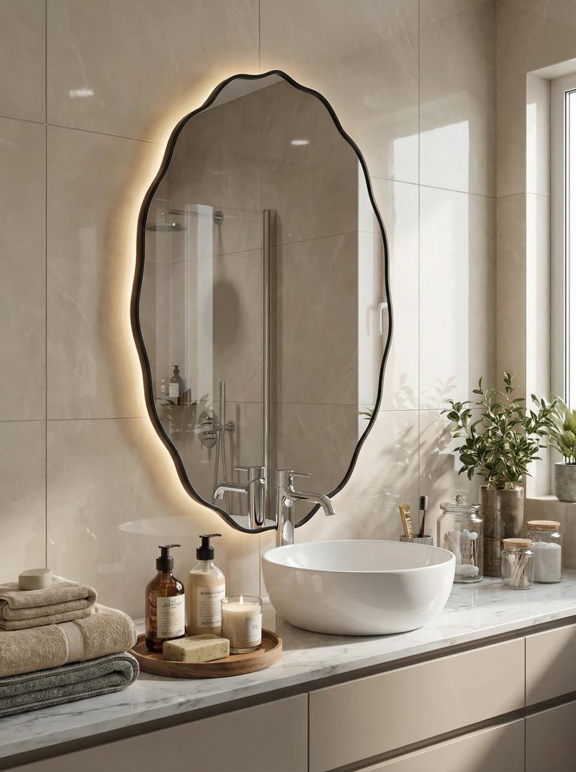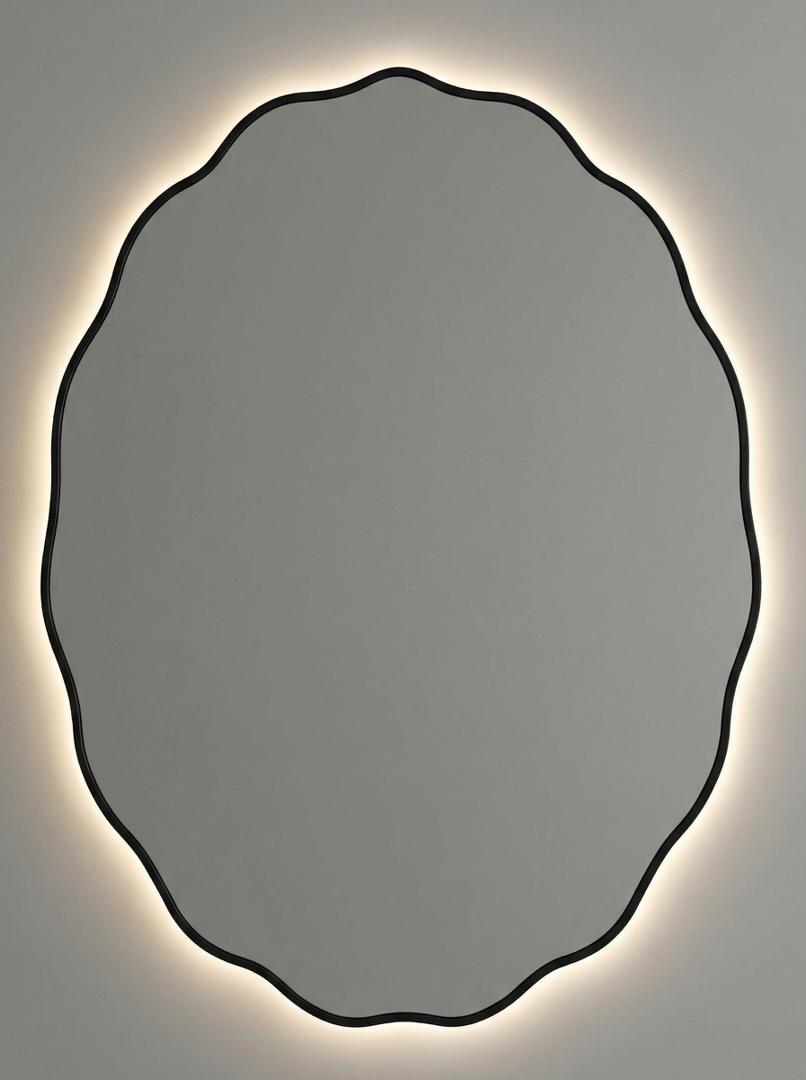 Зеркало в тонкой раме с интерьерной, фоновой подсветкой, рассотяние от стены всего 9 мм. Премиум лента COB со сплошным свечением, встроенный плоский блок питания 12V с влагозащитой IP67, работа от внешнего выключателя или шнура 220V (идет в комплекте). Температура свечения на выбор 3000K, 4000K, 6000K. Изделия можно использовать в помещениях с повышенной влажностью до 70%. Навешивается вертикально и горизонтально.
