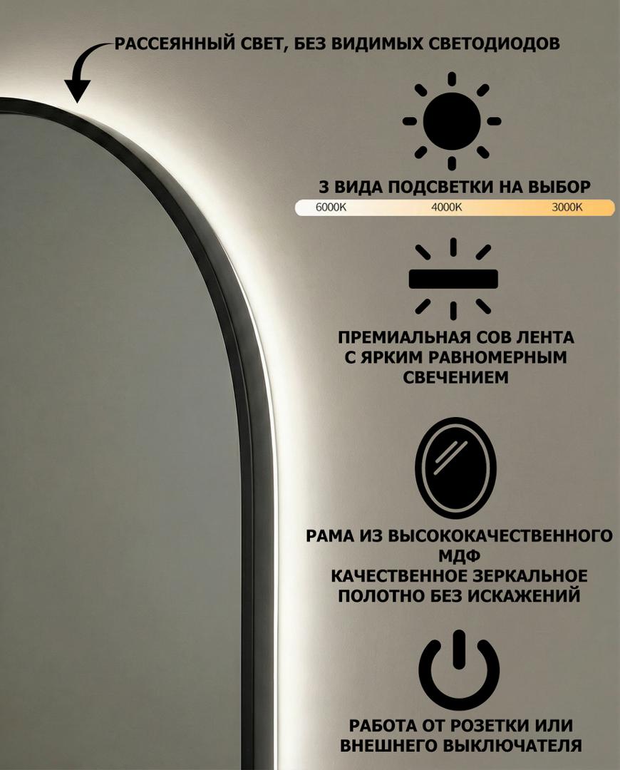 Зеркало в тонкой раме с интерьерной, фоновой подсветкой, рассотяние от стены всего 9 мм. Премиум лента COB со сплошным свечением, встроенный плоский блок питания 12V с влагозащитой IP67, работа от внешнего выключателя или шнура 220V (идет в комплекте). Температура свечения на выбор 3000K, 4000K, 6000K. Изделия можно использовать в помещениях с повышенной влажностью до 70%.