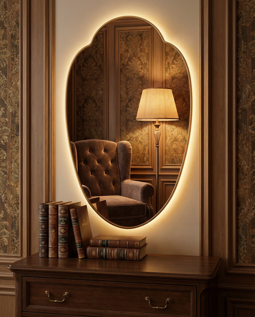Зеркало в тонкой раме с интерьерной, фоновой подсветкой, рассотяние от стены всего 9 мм. Премиум лента COB со сплошным свечением, встроенный плоский блок питания 12V с влагозащитой IP67, работа от внешнего выключателя или шнура 220V (идет в комплекте). Температура свечения на выбор 3000K, 4000K, 6000K. Изделия можно использовать в помещениях с повышенной влажностью до 70%. Навешивается вертикально.