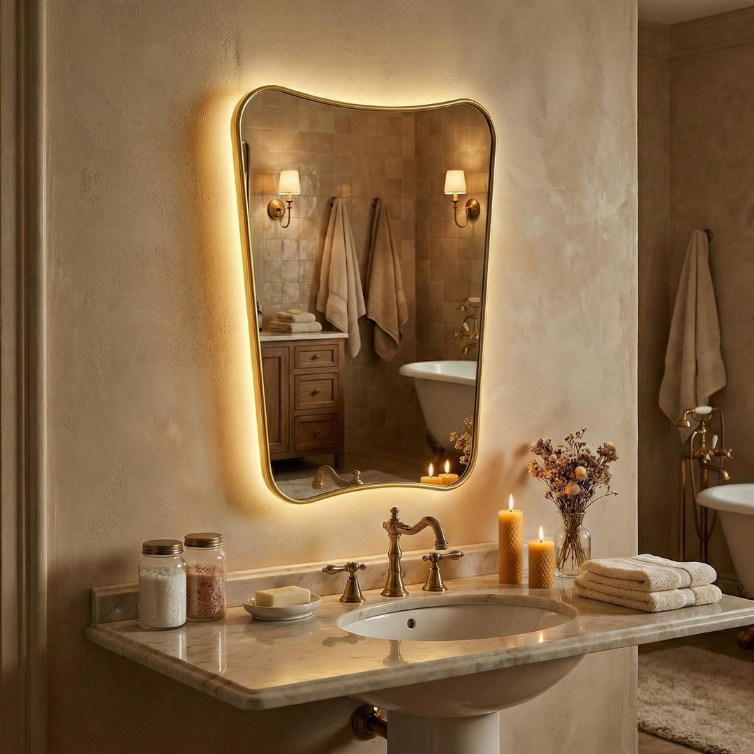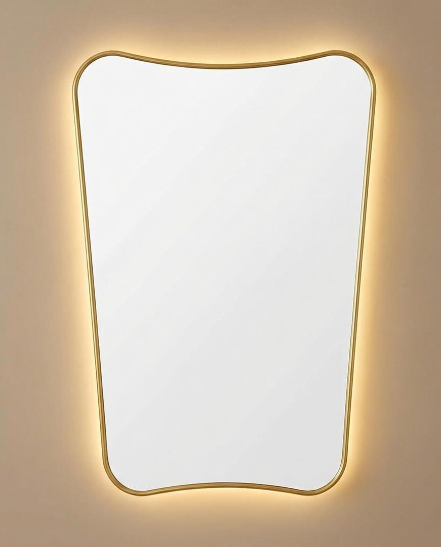 Зеркало в тонкой раме с интерьерной, фоновой подсветкой, рассотяние от стены всего 9 мм. Премиум лента COB со сплошным свечением, встроенный плоский блок питания 12V с влагозащитой IP67, работа от внешнего выключателя или шнура 220V (идет в комплекте). Температура свечения на выбор 3000K, 4000K, 6000K. Изделия можно использовать в помещениях с повышенной влажностью до 70%. Навешивается вертикально.