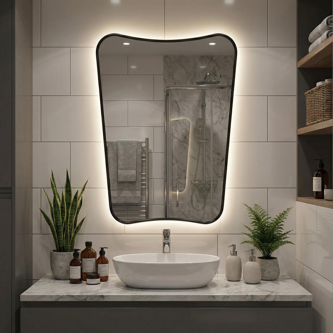 Зеркало в тонкой раме с интерьерной, фоновой подсветкой, рассотяние от стены всего 9 мм. Премиум лента COB со сплошным свечением, встроенный плоский блок питания 12V с влагозащитой IP67, работа от внешнего выключателя или шнура 220V (идет в комплекте). Температура свечения на выбор 3000K, 4000K, 6000K. Изделия можно использовать в помещениях с повышенной влажностью до 70%. Навешивается вертикально.