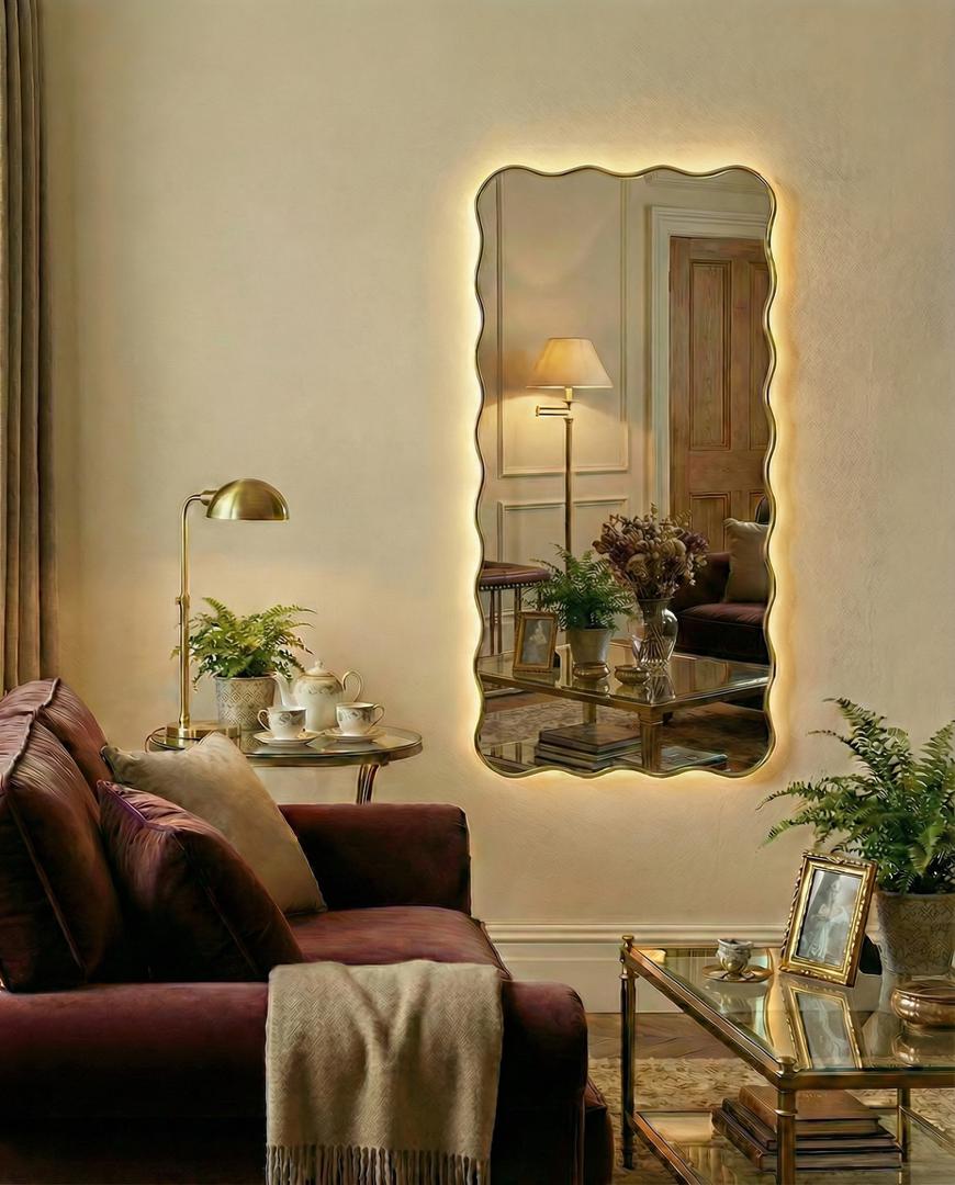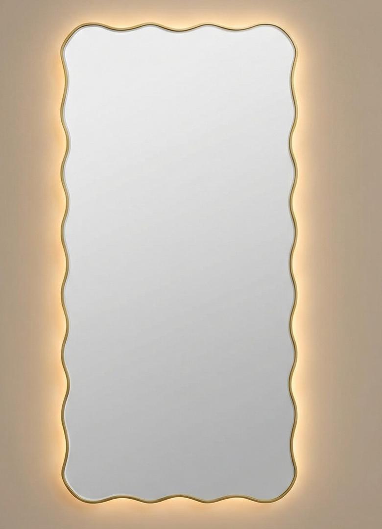 Зеркало в тонкой раме с интерьерной, фоновой подсветкой, рассотяние от стены всего 9 мм. Премиум лента COB со сплошным свечением, встроенный плоский блок питания 12V с влагозащитой IP67, работа от внешнего выключателя или шнура 220V (идет в комплекте). Температура свечения на выбор 3000K, 4000K, 6000K. Изделия можно использовать в помещениях с повышенной влажностью до 70%. Навешивается вертикально и горизонтально.