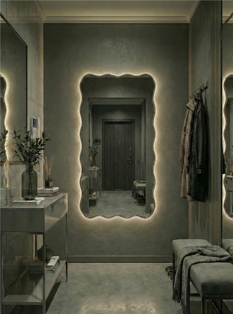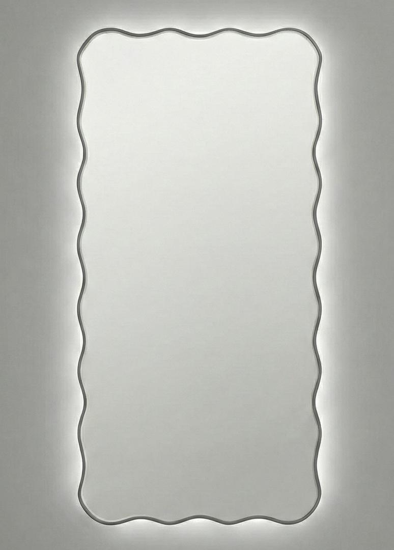 Зеркало в тонкой раме с интерьерной, фоновой подсветкой, рассотяние от стены всего 9 мм. Премиум лента COB со сплошным свечением, встроенный плоский блок питания 12V с влагозащитой IP67, работа от внешнего выключателя или шнура 220V (идет в комплекте). Температура свечения на выбор 3000K, 4000K, 6000K. Изделия можно использовать в помещениях с повышенной влажностью до 70%. Навешивается вертикально и горизонтально.