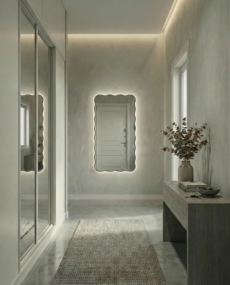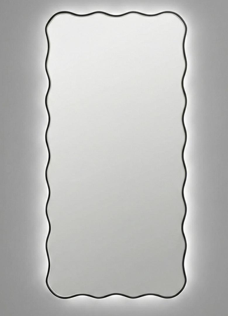 Зеркало в тонкой раме с интерьерной, фоновой подсветкой, рассотяние от стены всего 9 мм. Премиум лента COB со сплошным свечением, встроенный плоский блок питания 12V с влагозащитой IP67, работа от внешнего выключателя или шнура 220V (идет в комплекте). Температура свечения на выбор 3000K, 4000K, 6000K. Изделия можно использовать в помещениях с повышенной влажностью до 70%. Навешивается вертикально и горизонтально.