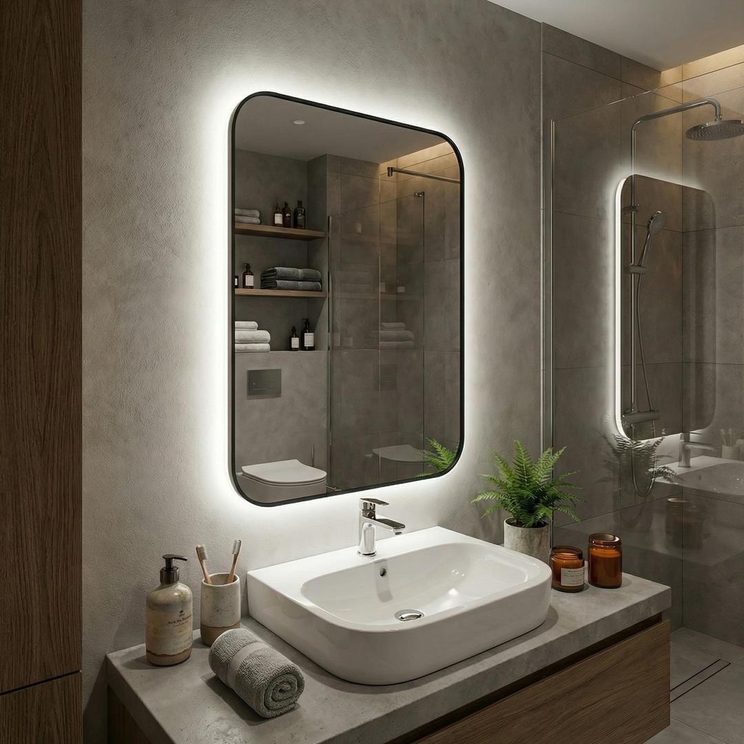 Зеркало в тонкой раме с интерьерной, фоновой подсветкой, рассотяние от стены всего 9 мм. Премиум лента COB со сплошным свечением, встроенный плоский блок питания 12V с влагозащитой IP67, работа от внешнего выключателя или шнура 220V (идет в комплекте). Температура свечения на выбор 3000K, 4000K, 6000K. Изделия можно использовать в помещениях с повышенной влажностью до 70%. Навешивается вертикально и горизонтально.