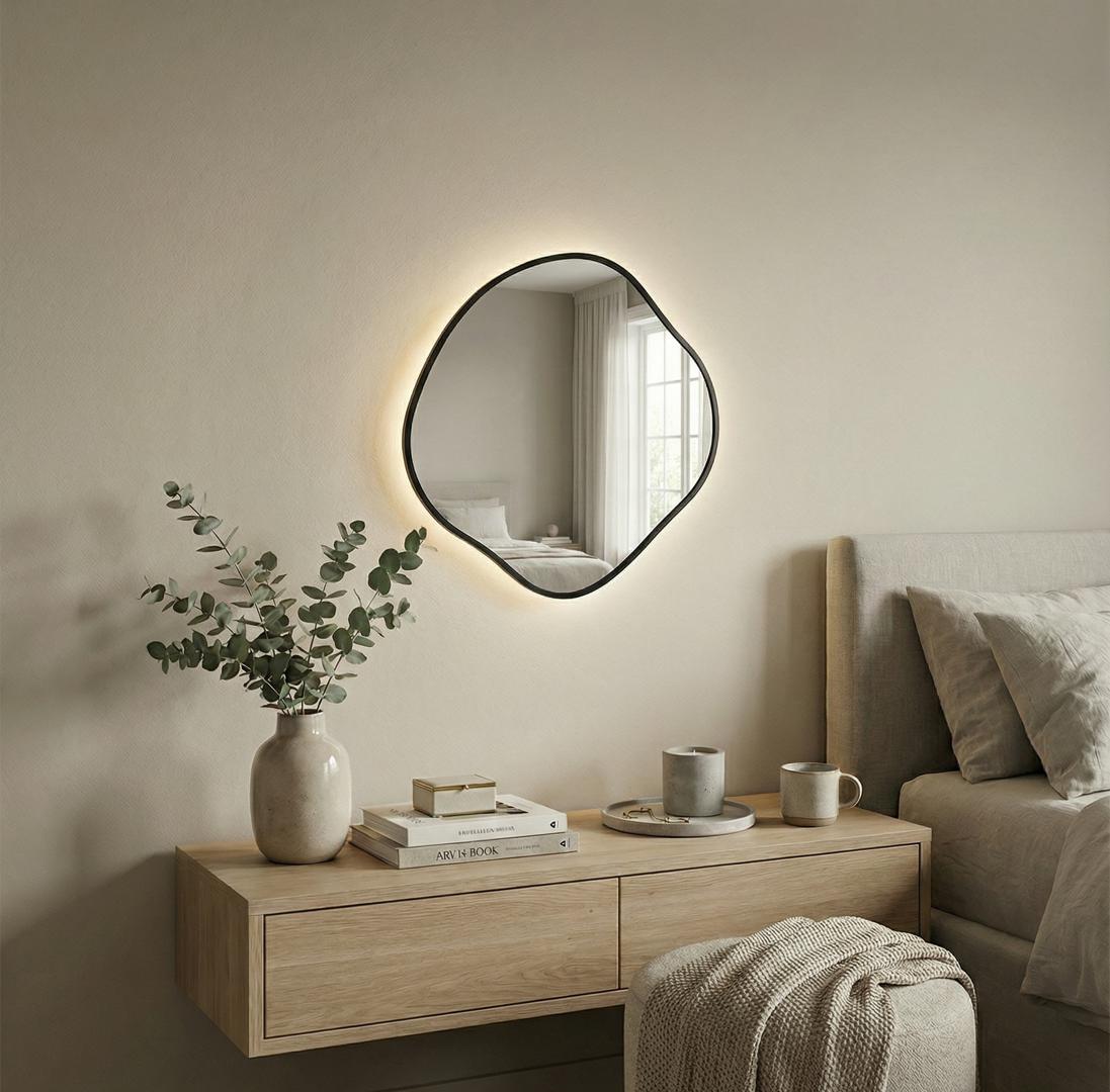 Зеркало в тонкой раме с интерьерной, фоновой подсветкой, рассотяние от стены всего 9 мм. Премиум лента COB со сплошным свечением, встроенный плоский блок питания 12V с влагозащитой IP67, работа от внешнего выключателя или шнура 220V (идет в комплекте). Температура свечения на выбор 3000K, 4000K, 6000K. Изделия можно использовать в помещениях с повышенной влажностью до 70%.